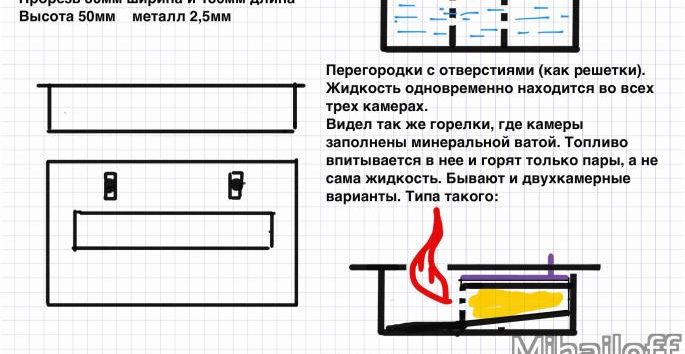 En fait, le réservoir devrait être composé de deux compartiments. Celui du bas sert à faire le plein de carburant. Les vapeurs liquides inflammables brûlent dans le compartiment supérieur. Entre ces compartiments, il doit y avoir une plaque de séparation avec des trous à travers lesquels les vapeurs pénètrent dans la zone de combustion. La forme du réservoir peut être différente, cela dépend du modèle de foyer.
