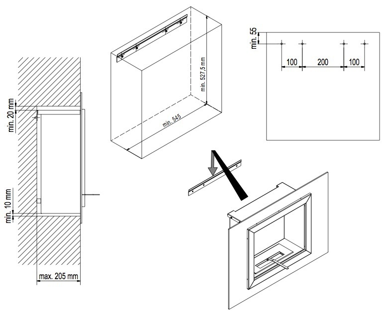 La technologie de création d'une structure murale n'est pratiquement pas différente des options de sol ou de bureau. Initialement, la conception est pensée, le type de foyer biologique est sélectionné - droit ou angulaire. Sur sa base, un dessin est développé, où la sécurité incendie est prise en compte avec des dimensions. En d'autres termes, la distance du foyer aux murs et à la cheminée doit être respectée (au moins 15 - 20 cm). Ensuite, des marquages ​​​​sont appliqués sur les murs et les travaux de construction commencent.