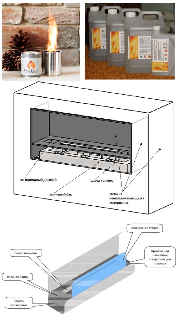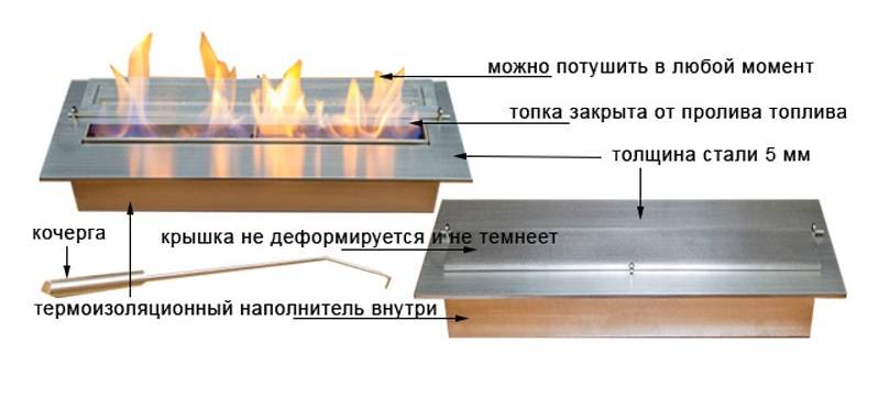 Une bio-cheminée est complètement différente d'une cheminée à bois conventionnelle. Pour obtenir une flamme, un carburant spécial (bioéthanol) est utilisé, qui est versé dans le réservoir et enflammé. Le carburant brûle sans émettre de monoxyde de carbone et d'autres produits nocifs. C'est en bref. Pour approfondir le processus de fonctionnement d'une cheminée bio, il est nécessaire d'étudier sa structure: