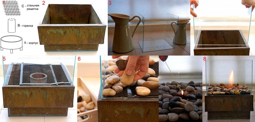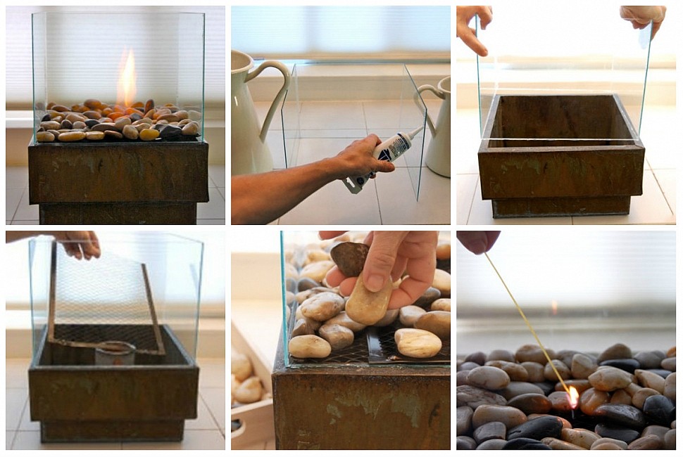 Les coutures restantes sont frottées, la surface est essuyée avec un chiffon humide et sec.Après cela, lors de la construction d'une bio-cheminée de vos propres mains, vous pouvez commencer à décorer - ajoutez un brûleur, disposez des éléments décoratifs. Des mesures de protection supplémentaires peuvent également être prises, telles que l'installation de verre résistant au feu sur le mur avant.