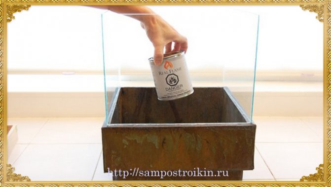- Préparation du réservoir de carburant. Vous pouvez utiliser une simple boîte métallique carrée ou rectangulaire, sans oublier la distance entre la flamme et le verre.