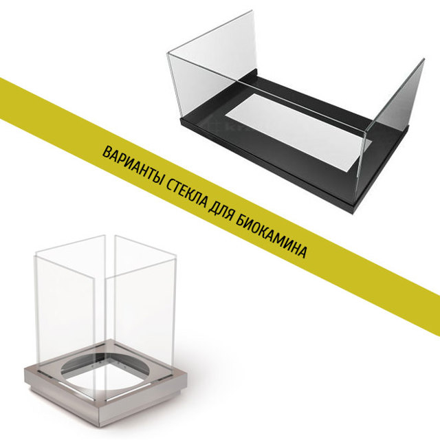 Un écran de protection en verre de fenêtre ordinaire avec des bords polis est installé sur la paroi avant de la biocheminée. Le bloc de combustible est décoré de bois de chauffage en céramique ou de pierres.