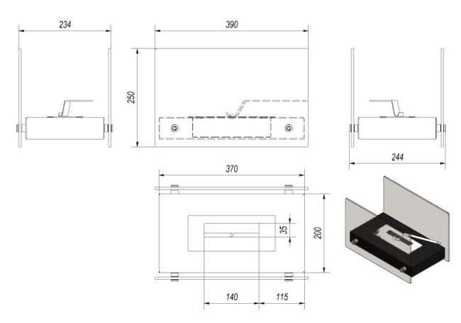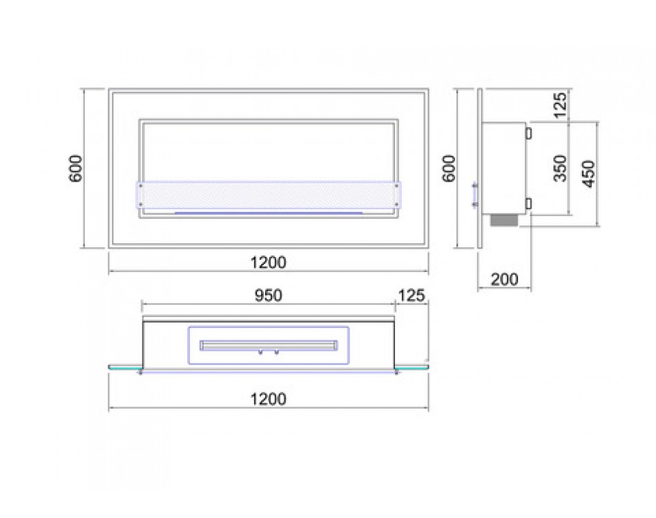 Tout d'abord, sur papier, découvrez comment fabriquer une cheminée bio. Esquissez un dessin simple avec des dimensions. Lors de la conception d'une cheminée de bureau, gardez à l'esprit que la distance entre le brûleur et la vitre la plus proche doit être de 16 cm ou plus. S'il y a 2 brûleurs ou plus, la distance entre les brûleurs est également supérieure à 16 cm.En conséquence, sur le papier, nous obtenons une cheminée de bureau.