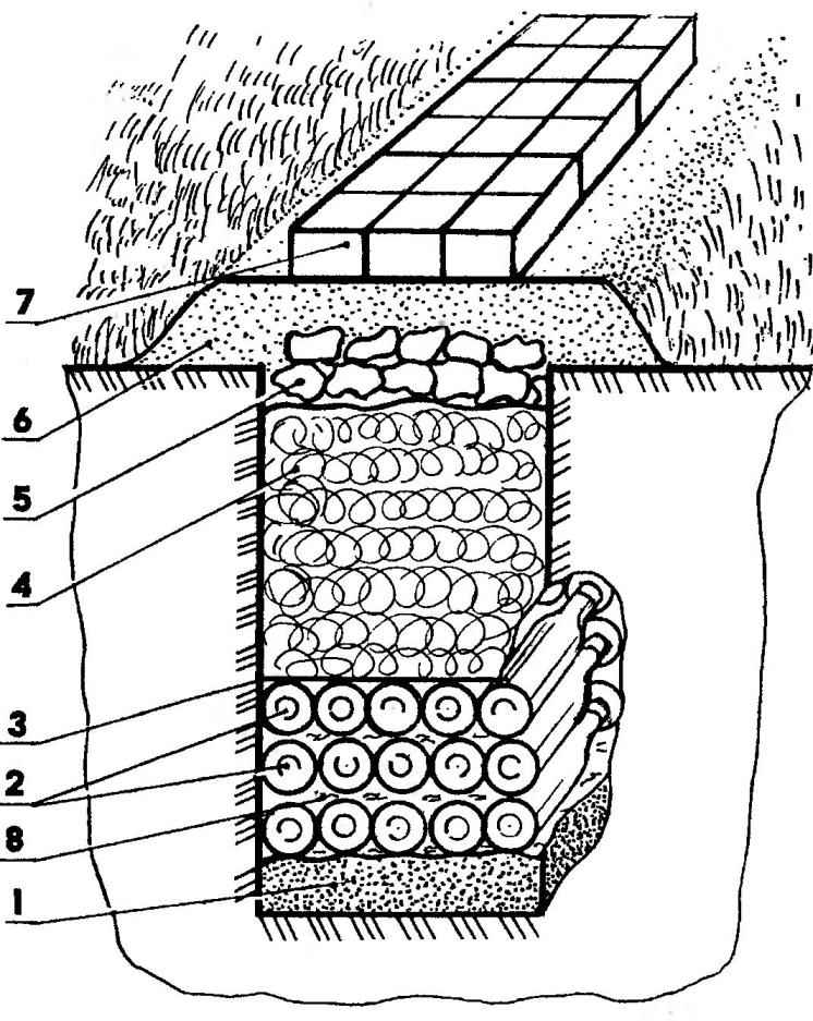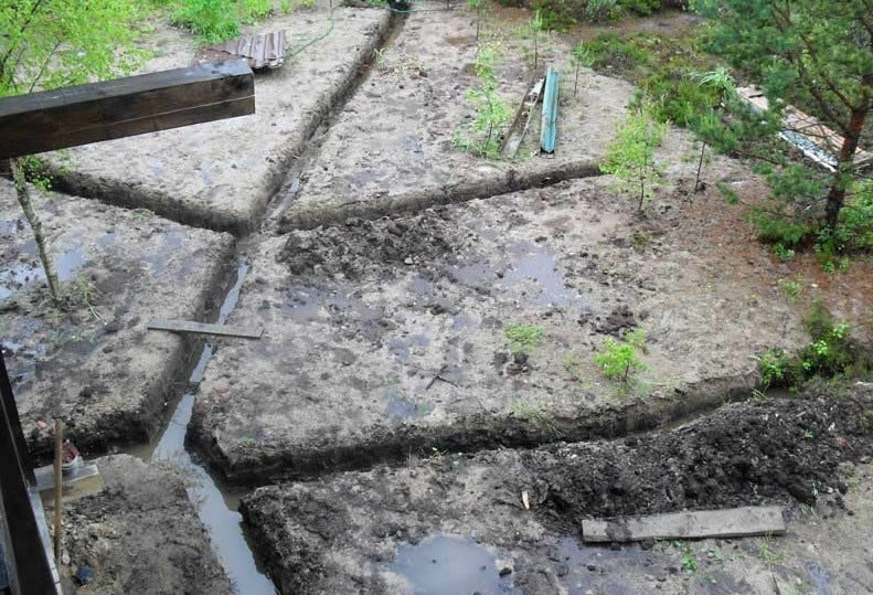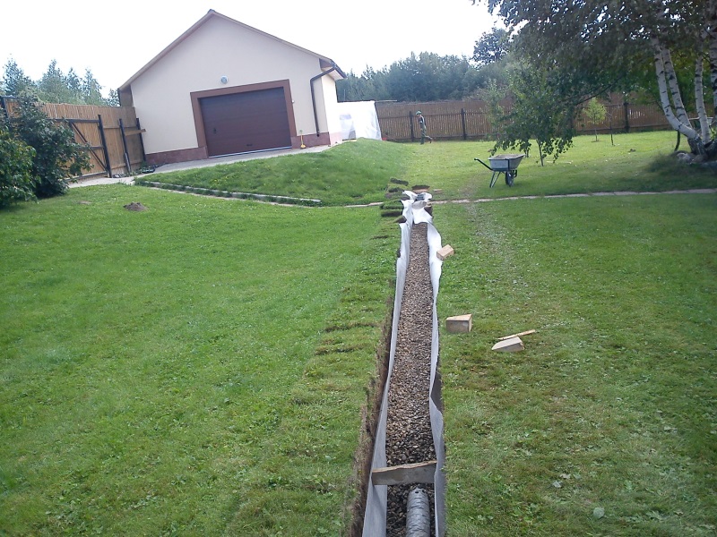 Selon le schéma, de petites tranchées sont creusées, qui sont bien percutées. Il faut observer la pente des fossés vers le puits ou les collecteurs d'eau. Si le site a une pente naturelle, la profondeur des canaux peut être la même. La profondeur des tranchées dans ce cas peut atteindre 80 cm et leur largeur est de 40 cm.