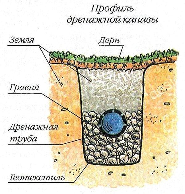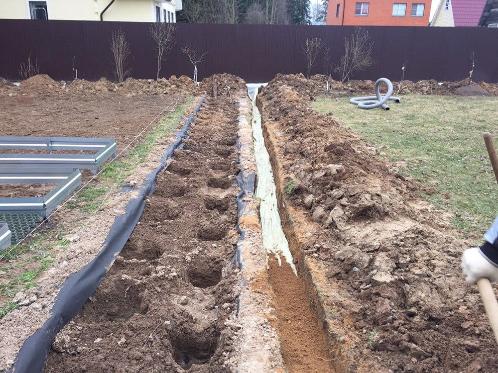 S'il n'est pas possible d'organiser un drainage superficiel des eaux en raison des caractéristiques du paysage ou pour toute autre raison, il est alors possible de drainer un terrain par drainage souterrain. Pour cela, des canaux sont creusés, un tuyau de drainage central et des tuyaux de drainage avec des branches y sont posés. Distance entre les drains dépend du type de sol. S'il s'agit d'argile, il devrait y avoir une distance d'environ 20 m entre les tuyaux de drainage, s'il s'agit de sable, alors 50 m.