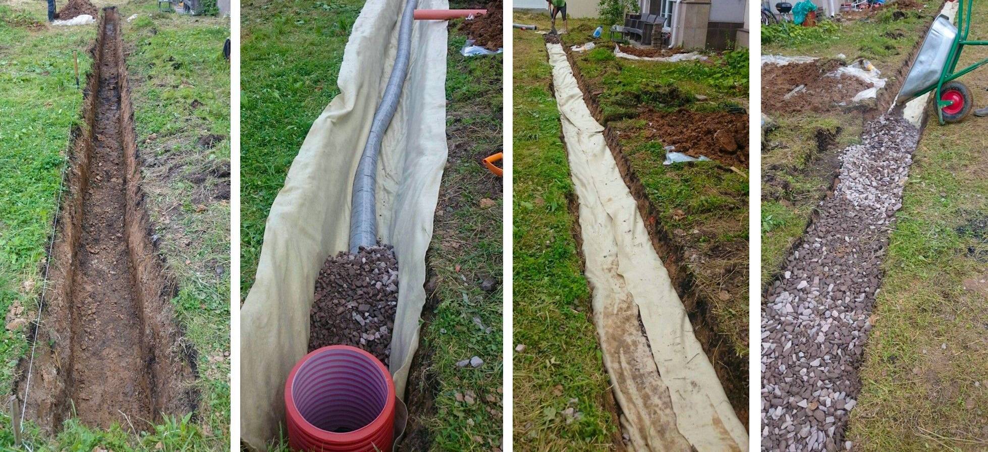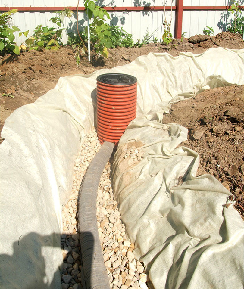 Ensuite, vous devez creuser des tranchées selon le schéma. Leur largeur est de 50 cm et la profondeur est de 120 cm dans la ligne principale et de 100 cm dans les lignes latérales. Les canaux principaux atteignent le puits, tandis que la pente est de 5 cm pour 1 mètre linéaire de longueur de tuyau. Au fond des fossés, du sable doit être versé avec une couche d'environ 20 cm, puis des géotextiles doivent être posés. Les bords de la toile doivent être plus hauts que les bords de la fosse. Ensuite, la pierre concassée est coulée en une couche de 20 cm, des tuyaux perforés sont posés en respectant la pente.