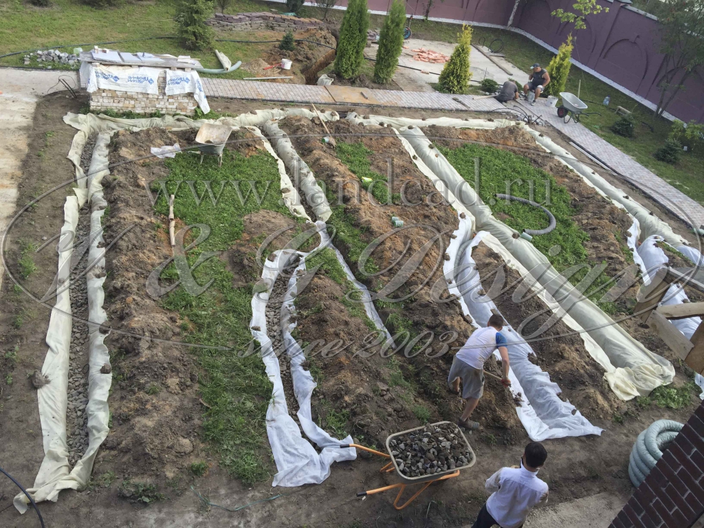 - En plus d'un tel système, selon les besoins, vous pouvez installer des planches pour les chemins ou équiper un bel étang.