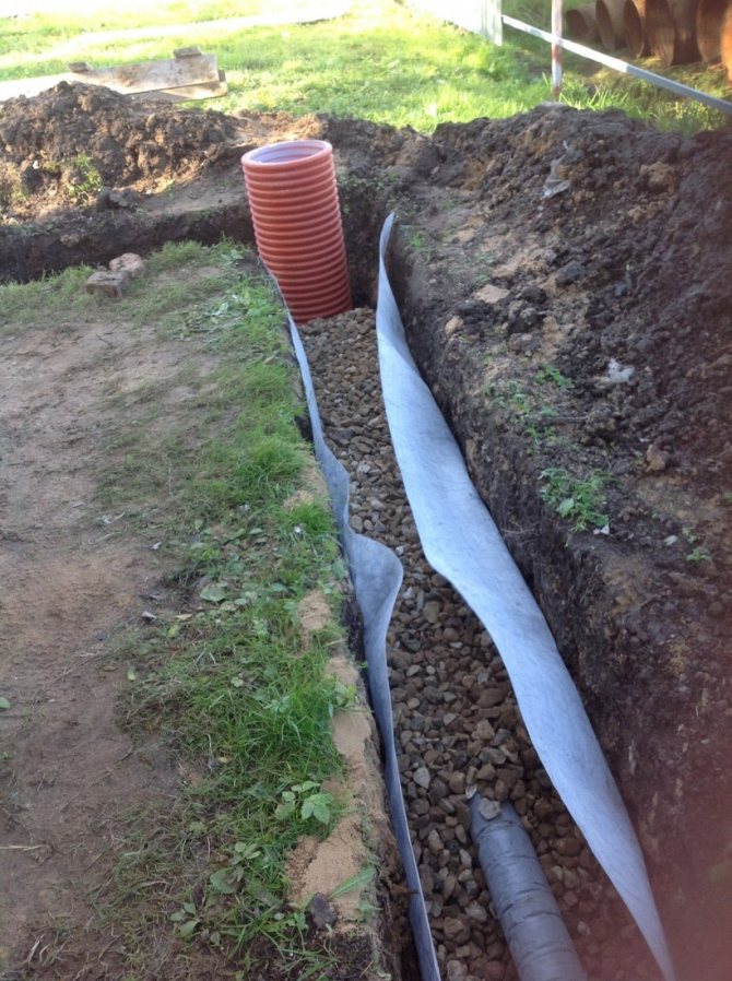 - Ensuite, des tuyaux en plastique sont posés, après quoi ils sont à nouveau recouverts d'environ la même couche de gravier. Les extrémités du géotextile s'enroulent pour former une barrière de protection. Le reste de la tranchée est recouvert de terre.