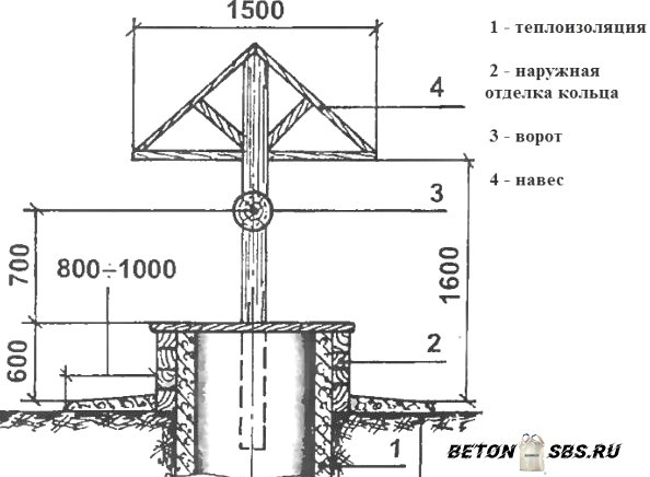 Nous construisons également un auvent au-dessus de la structure pour empêcher les précipitations de pénétrer dans la mine. Si une pompe est utilisée pour fournir de l'eau, il est préférable de fermer complètement l'arbre en laissant un petit trou pour le tuyau et le câble.