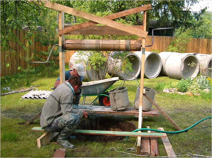 Lorsque le bord supérieur de l'anneau est au niveau du sol, le suivant est roulé. Il est placé strictement sur le dessus. Le travail continue. Si sur le premier anneau, le sol peut être jeté sur le côté avec une pelle à manche raccourci, alors sur le suivant, vous devez le retirer à l'aide d'une porte ou d'un trépied et d'un bloc. Ainsi, au moins deux personnes doivent travailler, et au moins trois, voire quatre, sont nécessaires pour tourner les anneaux. Il est donc impossible de creuser un puits tout seul, d'une seule main. A moins d'adapter le treuil.
