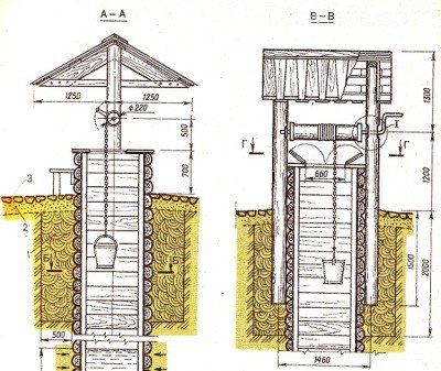 • un puits russe, l'eau en est extraite grâce à une corde enroulée sur un tambour spécial, au bout duquel un seau est attaché;