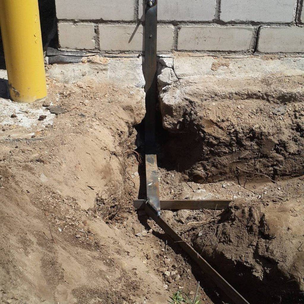 Nous coupons les extrémités des carrés avec une meuleuse à angle aigu pour faciliter le marquage. Nous les installons aux sommets du triangle et les battons avec un marteau. Ils partent assez facilement, et après quelques minutes le premier est prêt, on fait de même avec les deux autres. S'il y a une foreuse, vous pouvez forer un puits pour moins obstruer. Au-dessus du niveau inférieur de la tranchée, les tiges doivent dépasser de 30 centimètres.