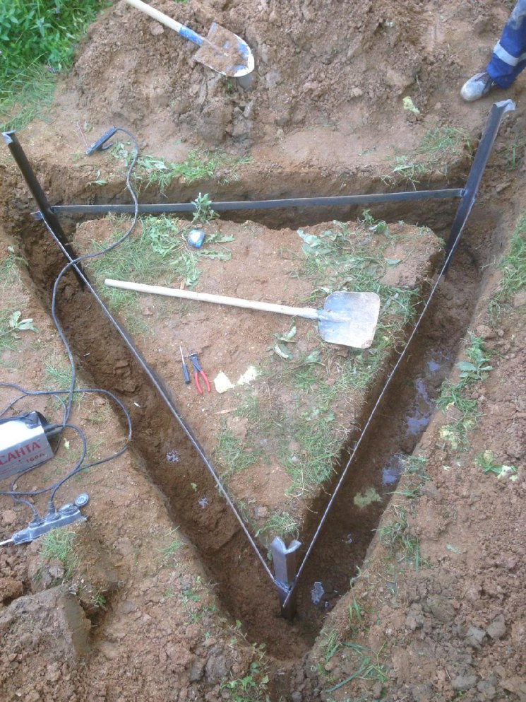En reculant de la fondation d'environ un mètre, nous marquons un triangle avec des côtés de 1,2 m. Nous creusons une tranchée le long des lignes de marquage jusqu'à une profondeur de 1 m. Nous faisons une largeur suffisante pour entreprendre des travaux de soudage. Il s'agit d'une tranchée pour les lignes de sol horizontales.