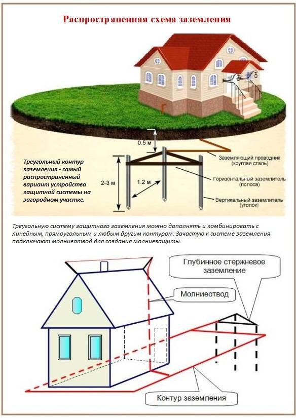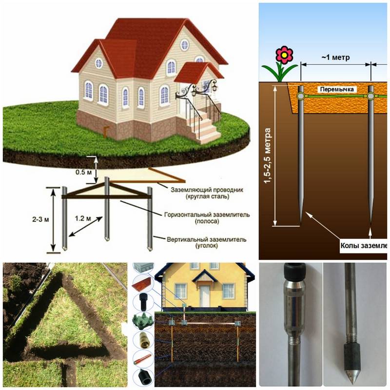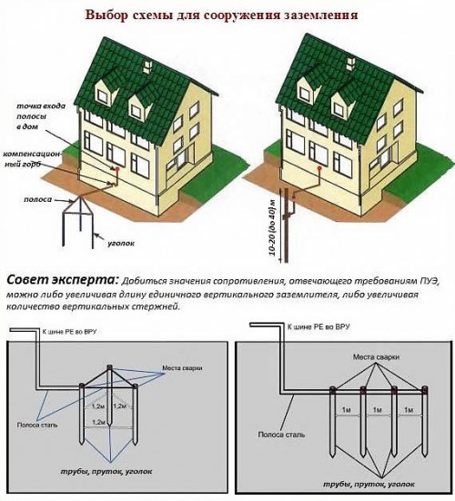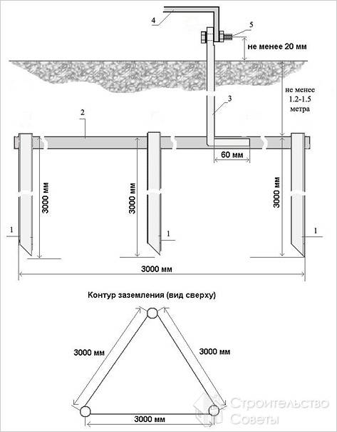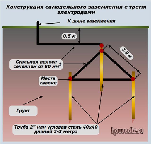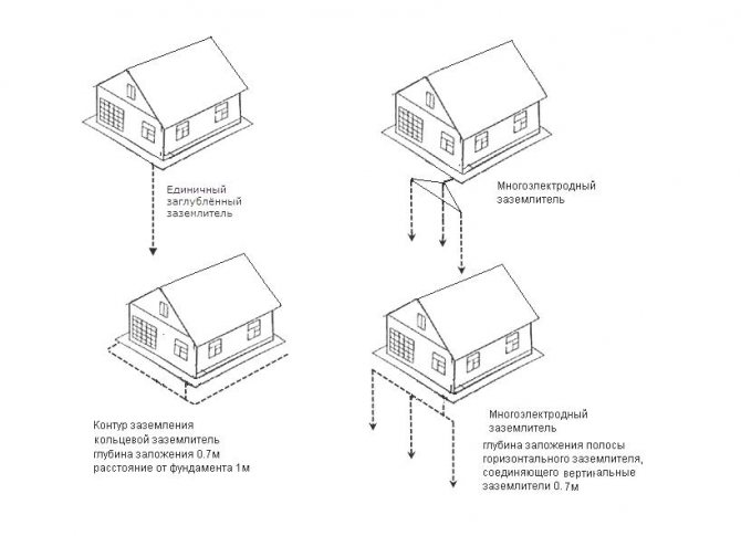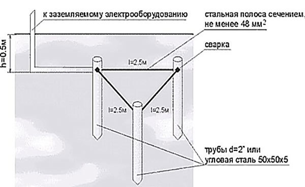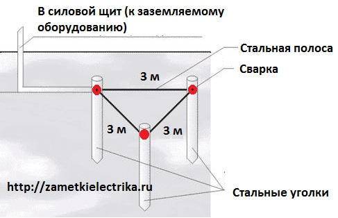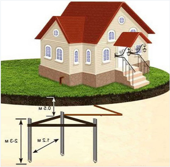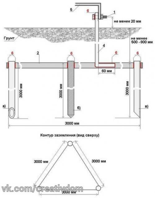Commençons par la forme de l'électrode de masse. Le plus populaire se présente sous la forme d'un triangle équilatéral, au sommet duquel des épingles sont bouchées. Il existe également une disposition linéaire (les trois mêmes pièces, uniquement en ligne) et sous la forme d'un contour - les broches sont martelées autour de la maison par incréments d'environ 1 mètre (pour les maisons d'une superficie de plus plus de 100 m²).Les broches sont interconnectées par des bandes métalliques - une liaison métallique.
