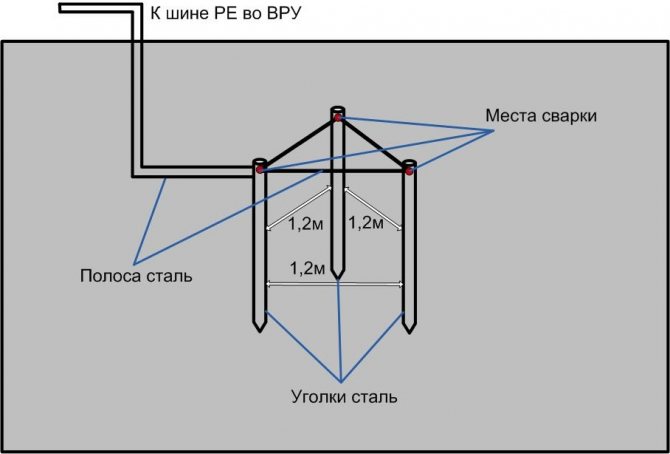 Une liaison métallique est soudée aux parties saillantes des tiges / coins - une bande de 40 * 4 mm. Le conducteur de terre créé avec la maison est relié à une bande métallique (40 * 4 mm) ou à un conducteur rond (section 10-16 mm2). Une bande avec un triangle métallique créé est également soudée. Lorsque tout est prêt, les points de soudure sont nettoyés du laitier, recouverts d'un composé anti-corrosion (pas de peinture).