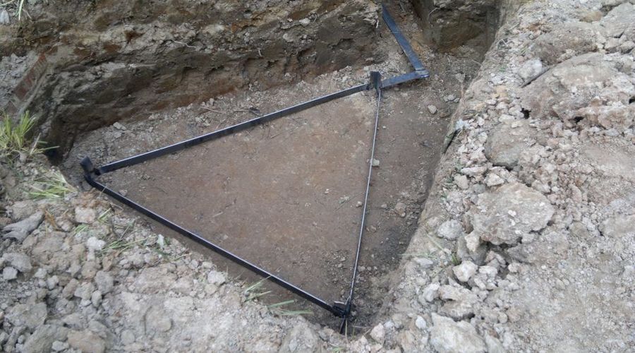 Après avoir choisi un emplacement, un marquage a été effectué (sous un triangle de 3 m de côté), l'emplacement de la bande boulonnée à placer sur la fondation du bâtiment a été déterminé, les travaux de terrassement peuvent commencer.