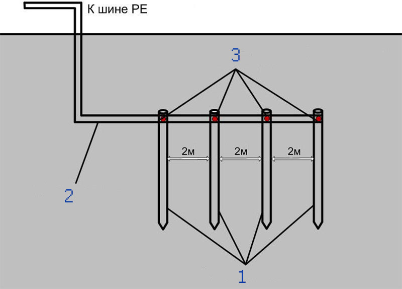Mais les paramètres de résistance d'une seule électrode de masse ne seront probablement pas suffisants pour organiser une boucle de masse répondant aux exigences du PUE. Comment tout aligner ? La zone de l'électrode de masse est critique, la solution la plus évidente consiste donc à marteler une autre électrode à proximité. Mais si vous les martelez à proximité, le courant se propage, comme avant, rien ne change. Pour changer la configuration d'étalement, il est nécessaire d'éloigner les électrodes de masse les unes des autres. Dans ce cas, la division du courant entre eux est obtenue - il découle de chacun d'eux.