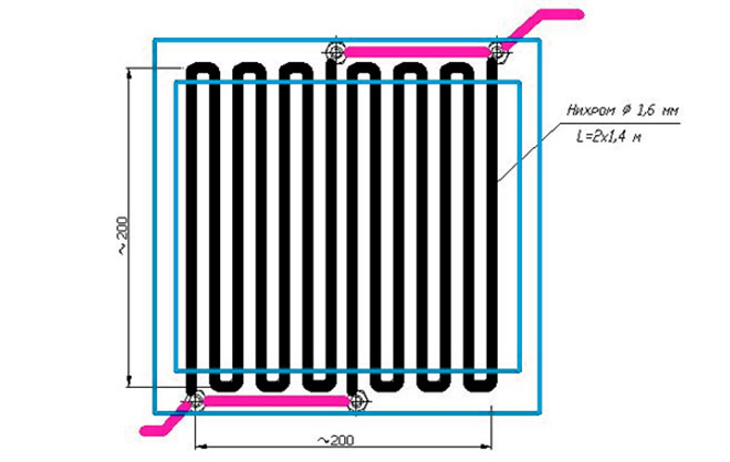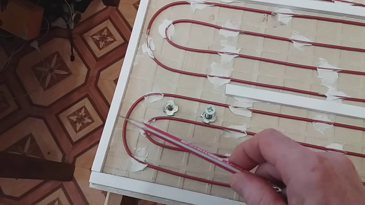 Nous plaçons les verres les uns sur les autres avec les côtés sur lesquels du graphite est appliqué et les fixons avec de la colle. Pour une plus grande fiabilité, la pièce résultante est placée dans un cadre en bois. Des bornes en cuivre et un fil sont fixés aux points de sortie du conducteur en graphite sur différents côtés du verre pour connecter l'appareil au secteur. Ensuite, les appareils de chauffage faits maison pour la pièce doivent être séchés pendant 1 jour. Vous pouvez connecter un thermostat dans une chaîne. Cela simplifiera le fonctionnement de l'équipement.