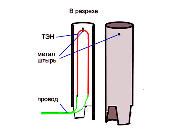 L'élément principal de l'élément chauffant est une spirale en nichrome ou autre matériau à haute résistance électrique qui, lorsqu'un courant électrique le traverse, commence à chauffer. La spirale est placée dans un tube de cuivre rempli de sable.