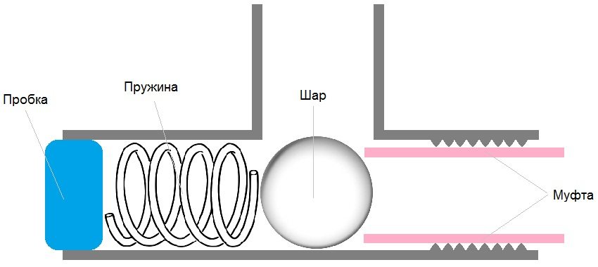 1. Tout d'abord, un accouplement est vissé dans le té, qui servira de selle pour l'élément de porte. Il est nécessaire de visser jusqu'à ce que le raccord ferme le trou latéral du té d'environ 2 mm. Cela est nécessaire pour que la balle ne saute pas dans le passage latéral.