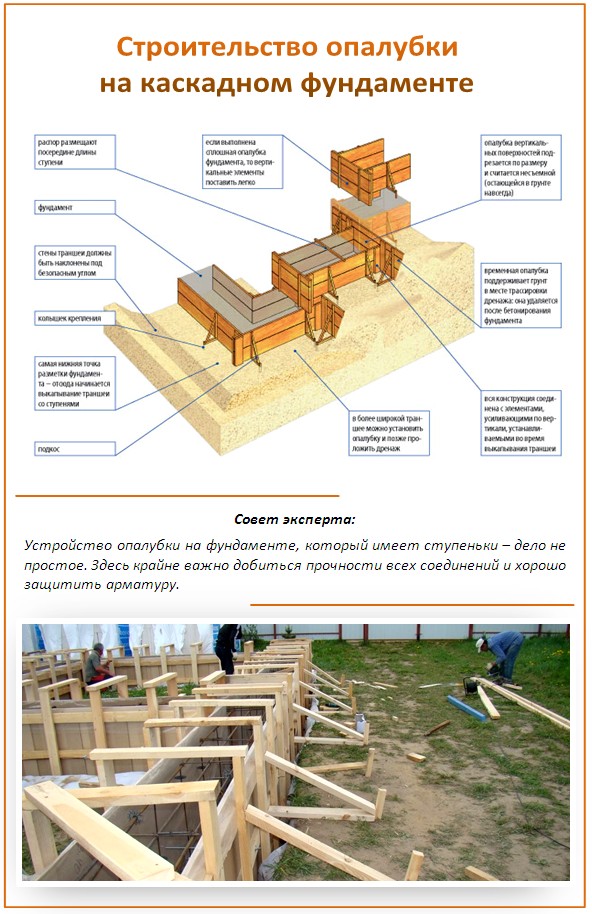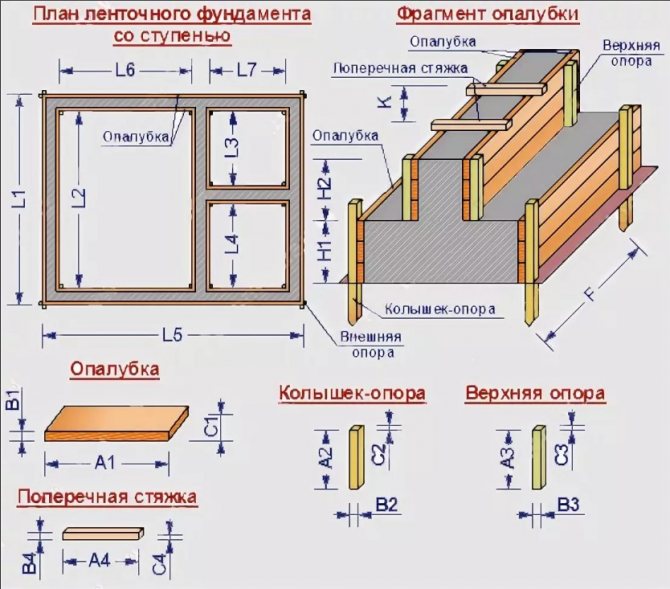 Lors de la construction d'une fondation rectangulaire en gradins d'une hauteur de 0,5 à 0,75 m, des boucliers sont utilisés de hauteur égale au paramètre correspondant de la base de la maison. La dimension intérieure du coffrage est identique à la largeur de la fondation. Réglez la dernière taille en étirant les cordons le long du fond de la tranchée.