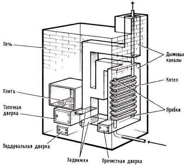 La chemise d'eau est disposée comme suit. Le réservoir en forme de U, dans lequel l'eau est chauffée, est monté dans le corps. Deux tuyaux de dérivation partent du réservoir : pour l'alimentation et le traitement. Le réservoir lui-même est alimenté par un raccordement dans la canalisation.