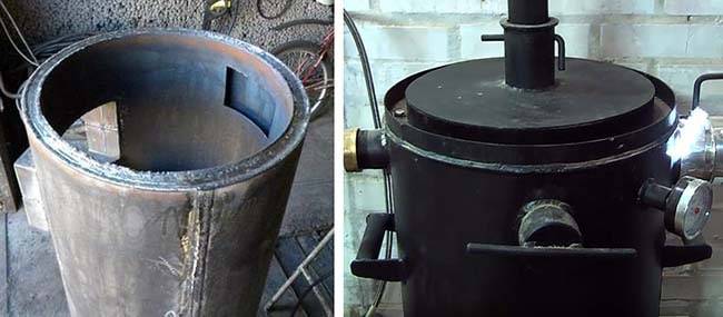 3. Les anneaux préparés sont soudés avec des cercles. Ainsi, les chambres de combustion du carburant sont formées. Vous devez vérifier l'étanchéité des soudures. Il est préférable de rendre la chambre de combustion inférieure (où l'exploitation minière est chargée) pliable. Cela simplifiera l'entretien du four au cas où il aurait besoin d'être nettoyé.