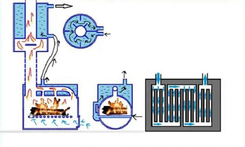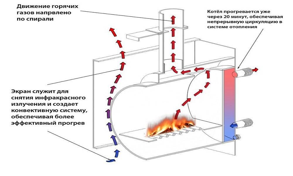 Le changement de température dans l'échangeur de chaleur se produit en raison de la vitesse de combustion du four. La chaleur passe en rayonnement, l'eau est chauffée dans la cheminée et après une autre demi-heure dans les tuyaux. Le système est inertiel en raison de la capacité calorifique élevée de l'eau, donc une grande quantité de carburant est nécessaire.