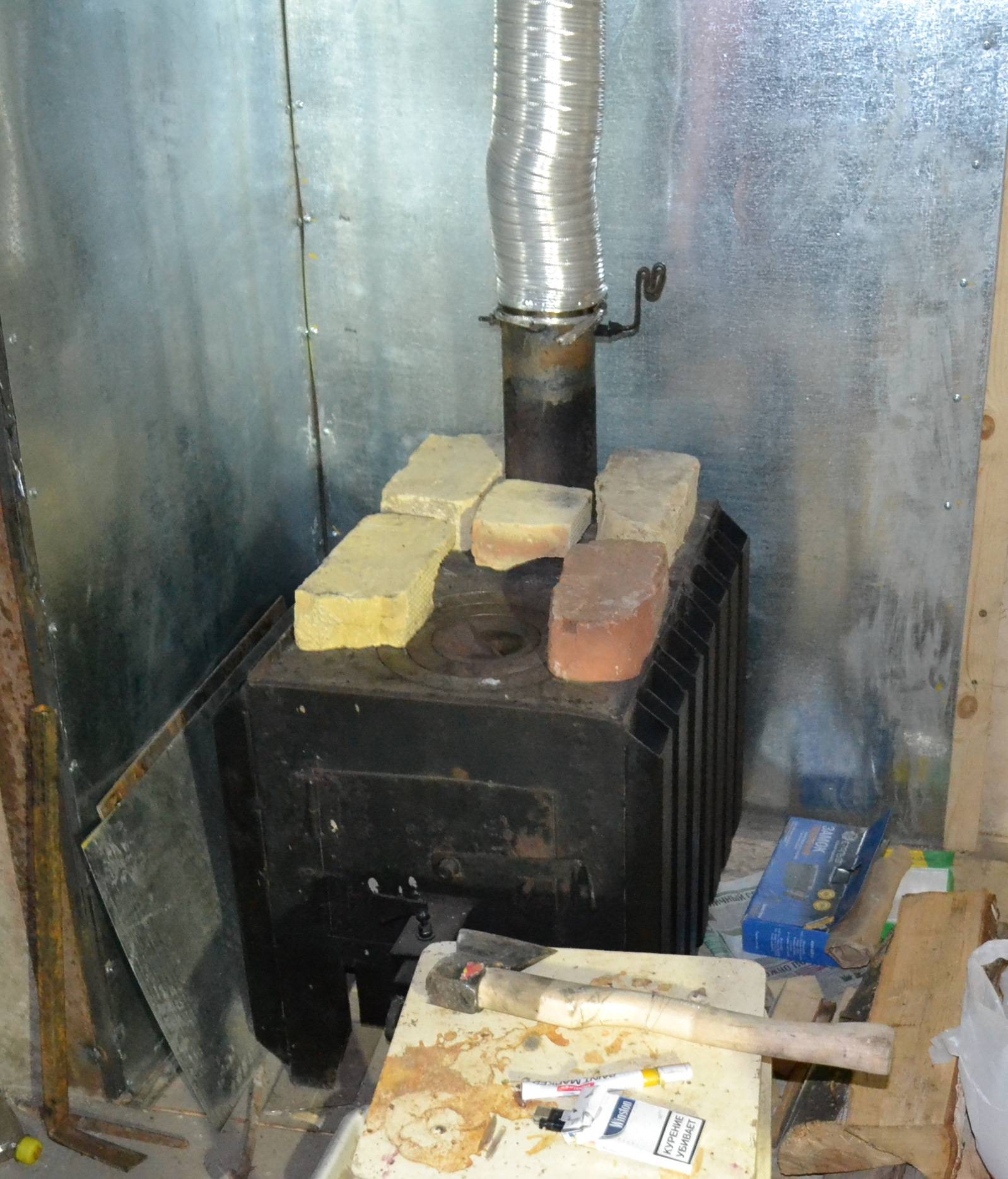 Les artisans attachent des feuilles de fer à 6 centimètres des parois du four. Ceci est fait pour que l'énergie thermique soit transférée par convection, grâce à laquelle l'air se déplace entre les plaques installées et le corps du poêle à ventre plat.