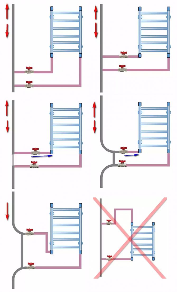 Vous pouvez trouver les exigences techniques pour l'installation d'un sèche-serviettes dans SP 30.13330.2012 (il s'agit d'un SNiP 2-04-01-85 mis à jour). Schémas de connexion populaires Afin de ne pas exposer le mur et le tuyau à des charges dues aux déformations de la température, l'installation d'un sèche-serviettes à eau doit être effectuée sur des supports de suspension et non sur un support rigide.Le support du sèche-serviettes doit être au même niveau pour que la bobine soit fixée uniformément, sinon elle risque d'être arrachée par la pression.