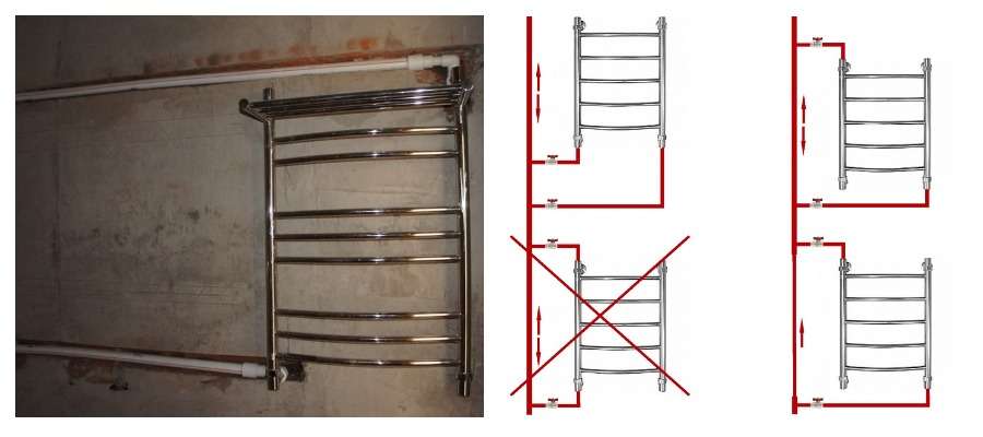 Si vous souhaitez que le sèche-serviettes remplisse normalement ses fonctions, il est nécessaire d'assurer une légère pente du tuyau d'alimentation dans le sens du débit d'eau chaude. Pour toute la longueur de l'eye-liner, sa longueur est de 5 à 10 mm. Le débit d'eau doit passer du point haut du circuit sèche-serviettes vers le bas. A cet effet, la cloche supérieure du radiateur est simplement reliée à la colonne montante d'eau chaude.