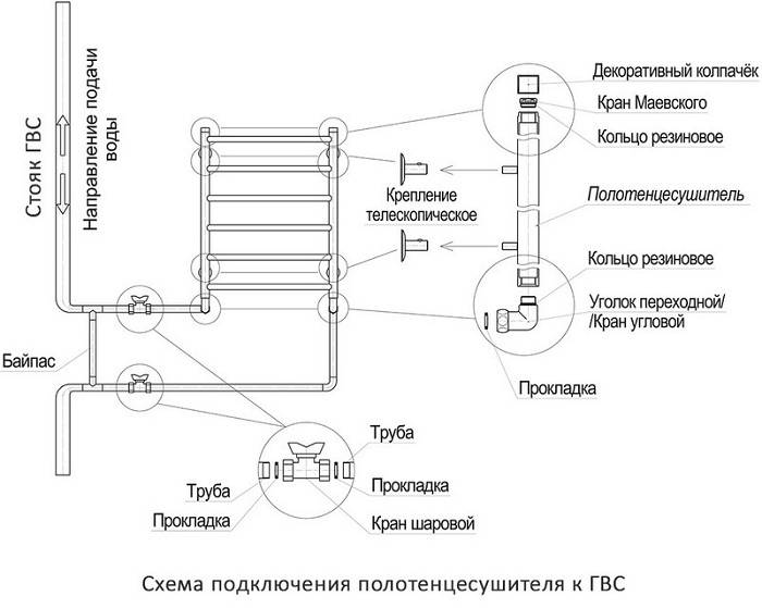 Vous pouvez accrocher un porte-serviettes chauffant sans cavalier. Cependant, la plupart des plombiers recommandent d'installer ce dernier. Le by-pass est monté sur des raccords prédécoupés dans les canalisations. Si nécessaire, des fils sont coupés sur les entrées. Si des travaux sont effectués sur des tuyaux en acier, le contournement de la même section est soudé à ce dernier. Des vannes à bille sont montées aux extrémités de la bobine. Dans ce cas, il peut également être nécessaire d'enfiler les anciens tuyaux.