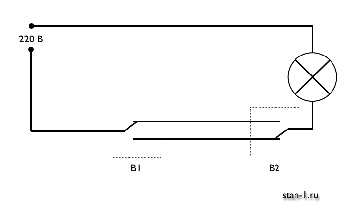 Un autre cas d'utilisation de ce schéma de contrôle est une grande chambre avec plusieurs lits. Si vous installez des interrupteurs à chaque lit, vous pouvez allumer la lumière sans vous lever. L'installation de tels dispositifs est justifiée dans les chalets d'été, les parcelles personnelles, les cours de maisons privées. Vous pouvez allumer la lumière à la sortie de la maison - après la fin des travaux, il n'est pas nécessaire d'aller dans le noir.