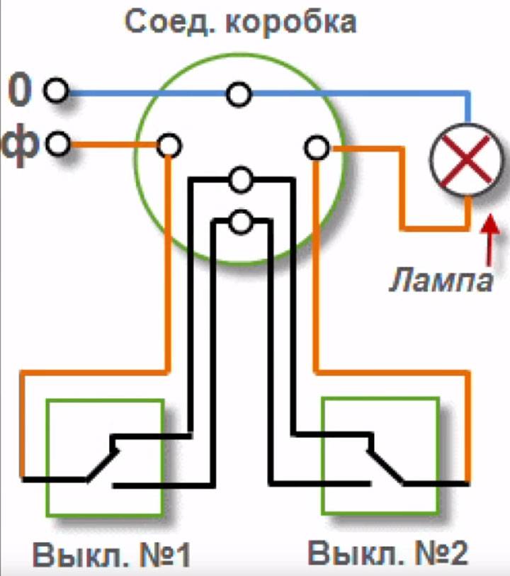 Le circuit utilise deux interrupteurs de traversée et une boîte de jonction, dans laquelle les fils d'une lampe contrôlée et les fils à trois fils des interrupteurs sont connectés. La section du fil tripolaire alimentant les interrupteurs de traversée doit être choisie en fonction de la puissance du luminaire commandé (1).