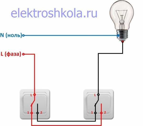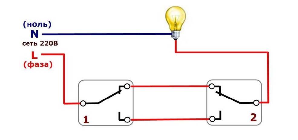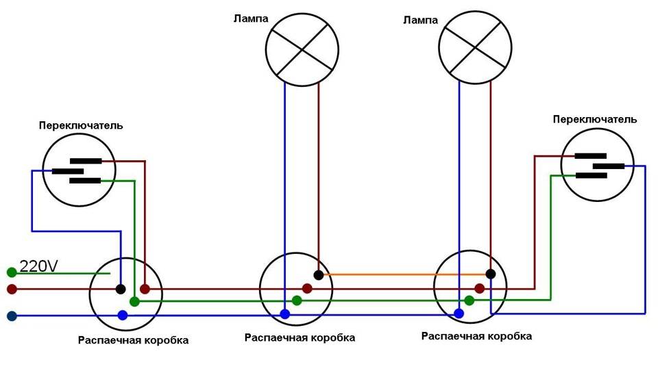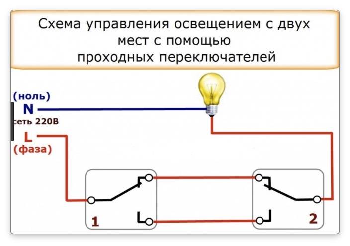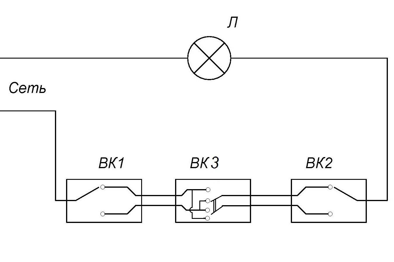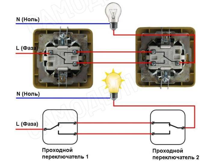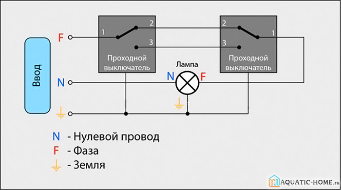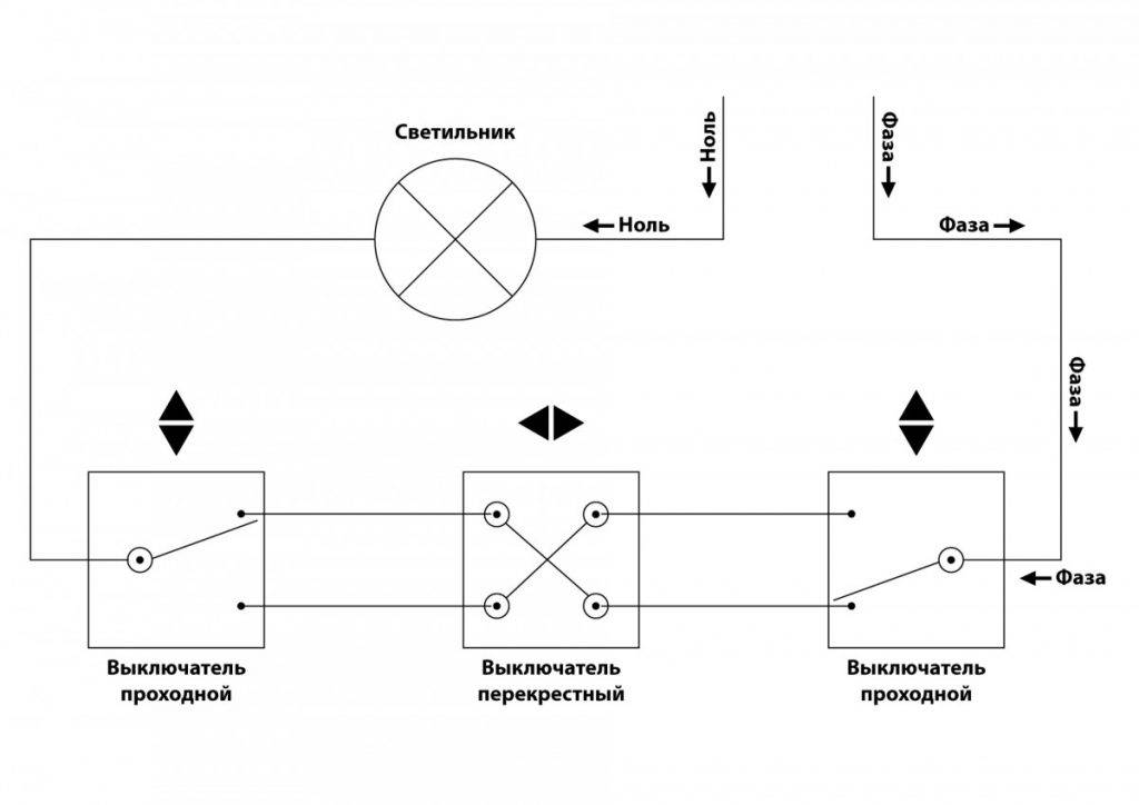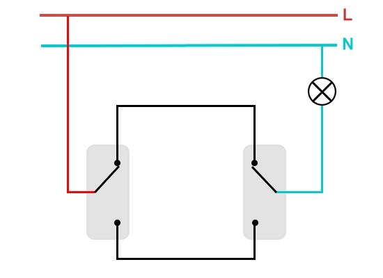 Le schéma de branchement n'est pas beaucoup plus compliqué que le schéma de branchement d'un interrupteur classique. La différence réside uniquement dans un plus grand nombre de contacts : un interrupteur conventionnel a deux contacts et un interrupteur traversant a trois contacts. Deux contacts sur trois sont considérés comme courants. Dans le circuit de commutation d'éclairage, deux commutateurs similaires ou plus sont utilisés.