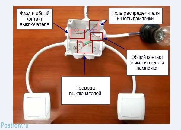 Les contacts de la lampe sont connectés au fil neutre. La phase est connectée à l'un des PV. Les contacts sont connectés en série via la boîte de jonction dans la pièce, après quoi ils sont envoyés à tous les luminaires. Pour faciliter l'utilisation, les câbles sont marqués ou des produits de couleurs différentes sont immédiatement utilisés.