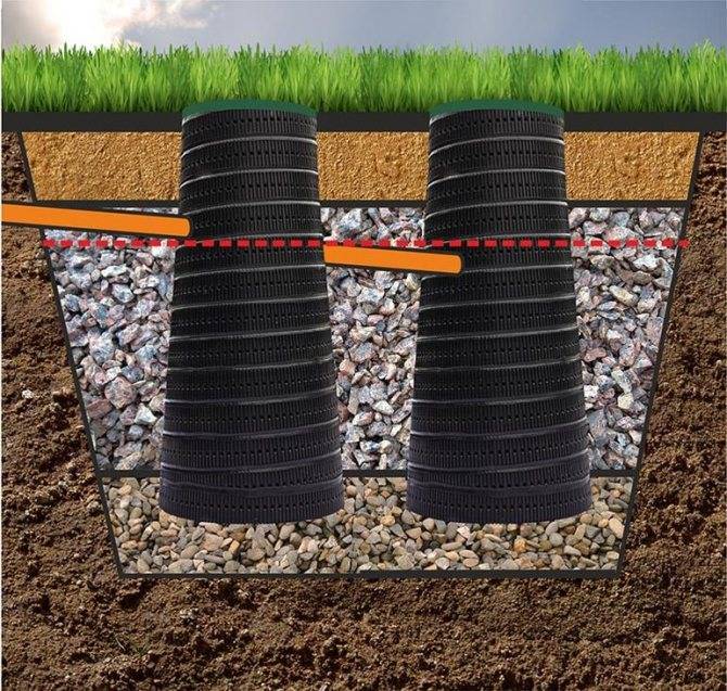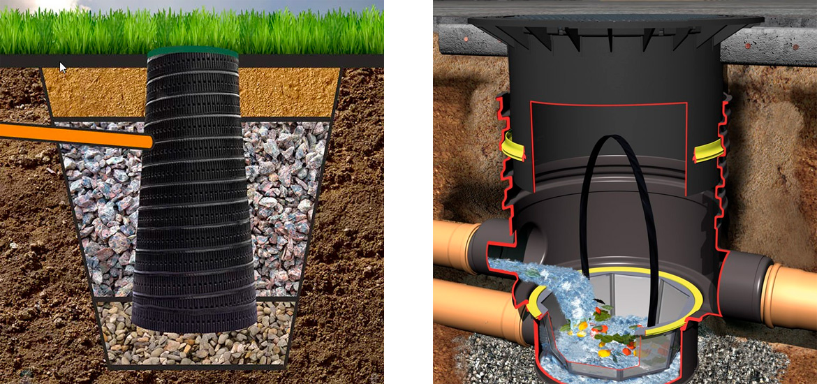 Le diamètre de ces puits, en règle générale, ne dépasse pas un an et demi et la profondeur d'occurrence peut atteindre deux mètres. Il est permis de drainer les deux systèmes dans un seul puits. Le conteneur de filtre est installé dans le le point le plus bas de la parcellede sorte que l'eau s'y écoule par gravité naturelle.