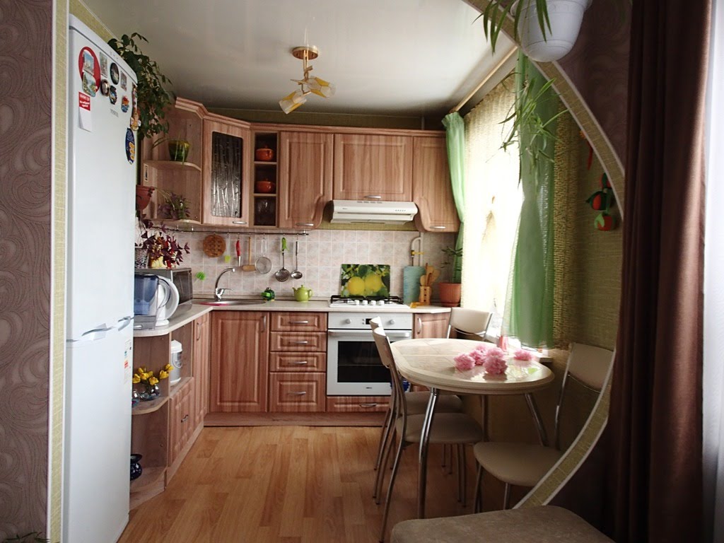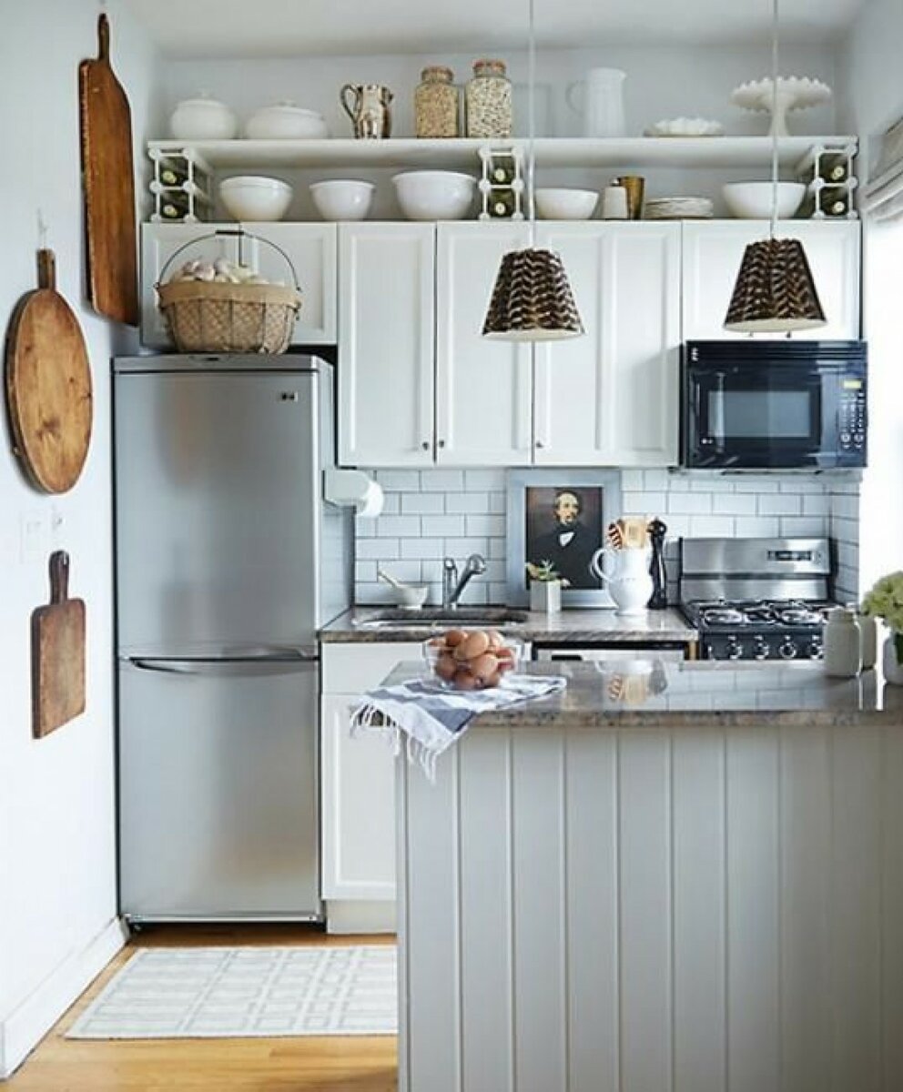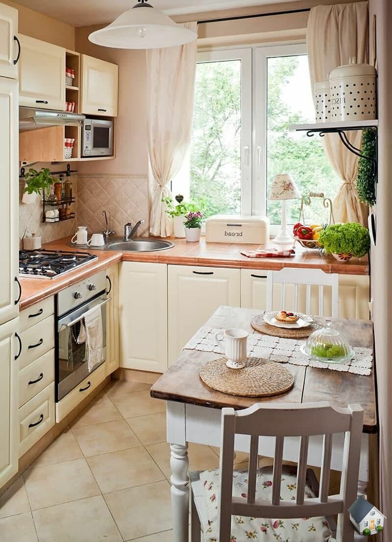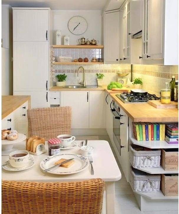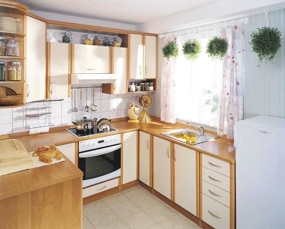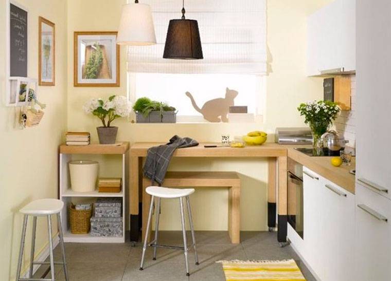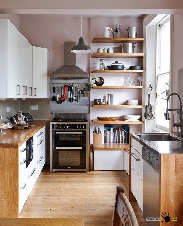 Le plus souvent, dans les petites cuisines, un agencement strict en forme de L des meubles et des gros appareils électroménagers est effectué. L'évier est situé dans le coin du casque, du réfrigérateur et de la cuisinière à droite et à gauche. quelquefois dans une petite cuisine peut même accueillir un comptoir de bar. Dans la plus petite cuisine, il peut complètement remplacer la table à manger.