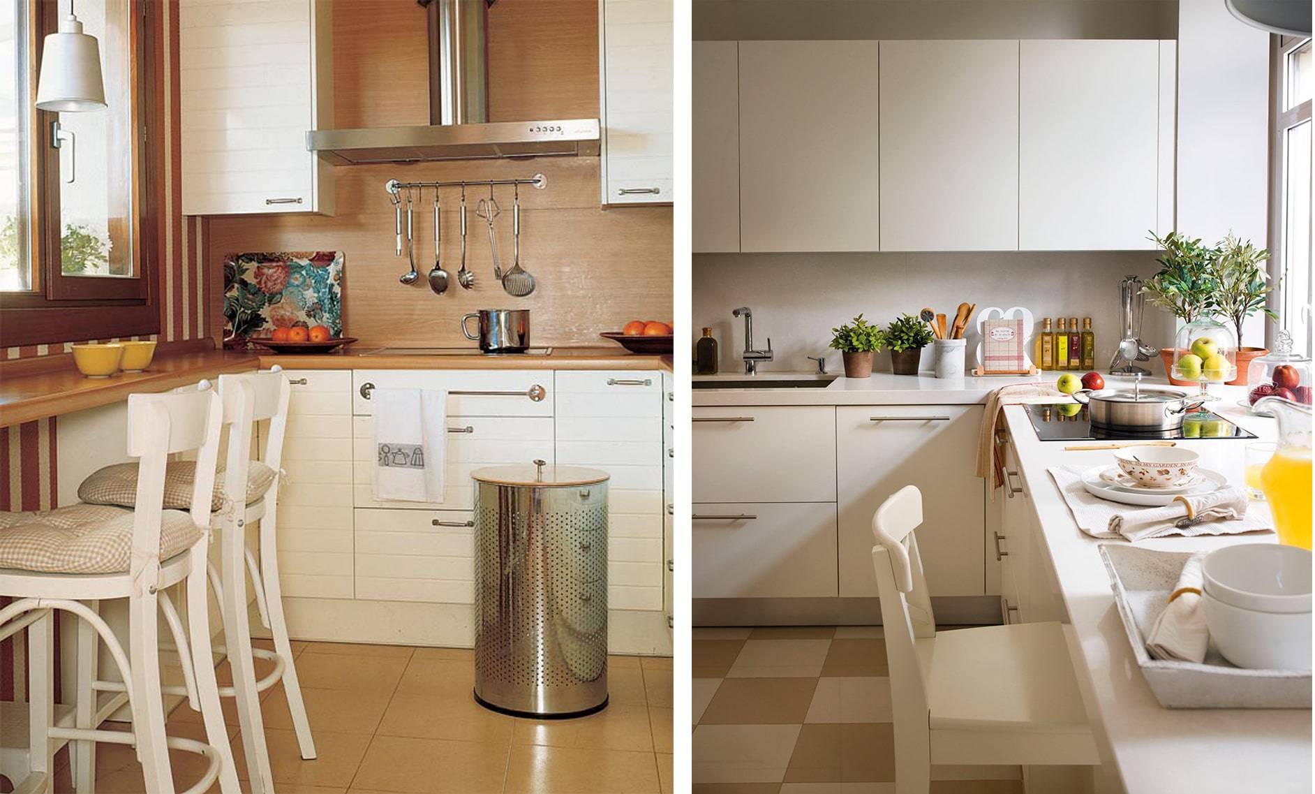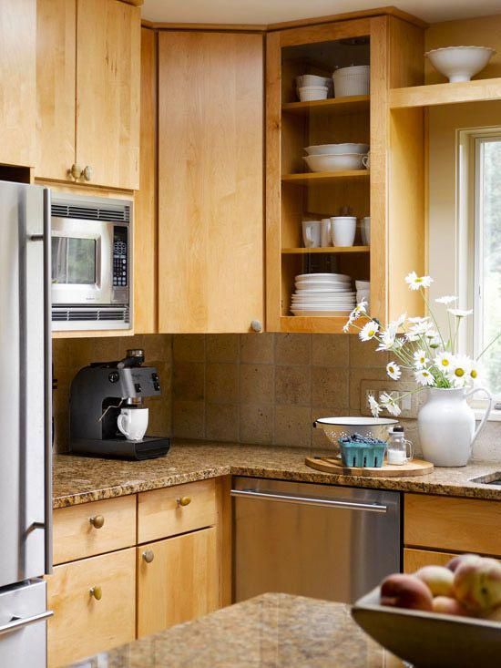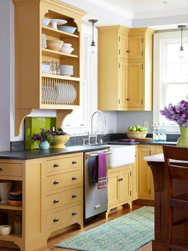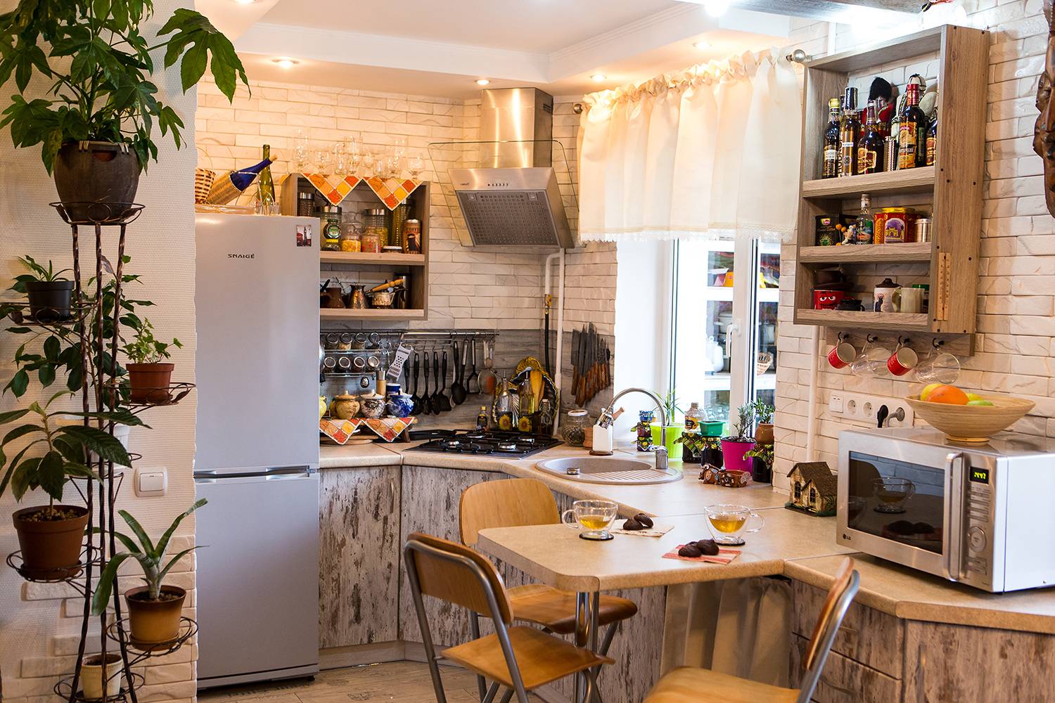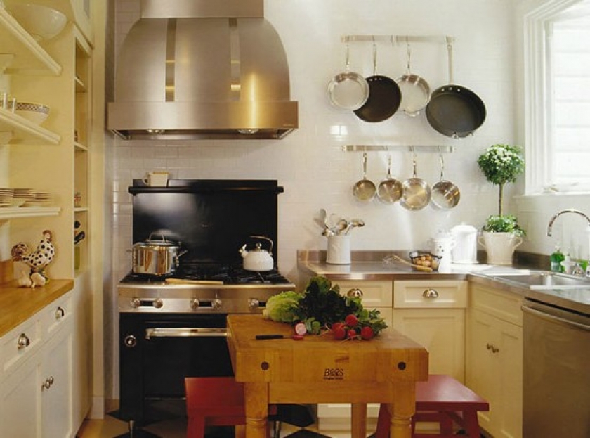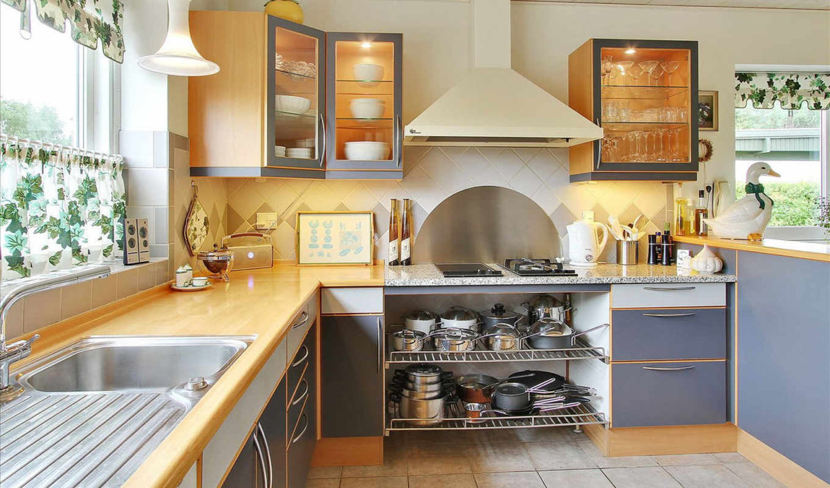 Le plus souvent, dans les petites cuisines, un agencement strict en forme de L des meubles et des gros appareils électroménagers est effectué. L'évier est situé dans le coin du casque, du réfrigérateur et de la cuisinière à droite et à gauche. quelquefois dans une petite cuisine peut même accueillir un comptoir de bar. Dans la plus petite cuisine, il peut complètement remplacer la table à manger.