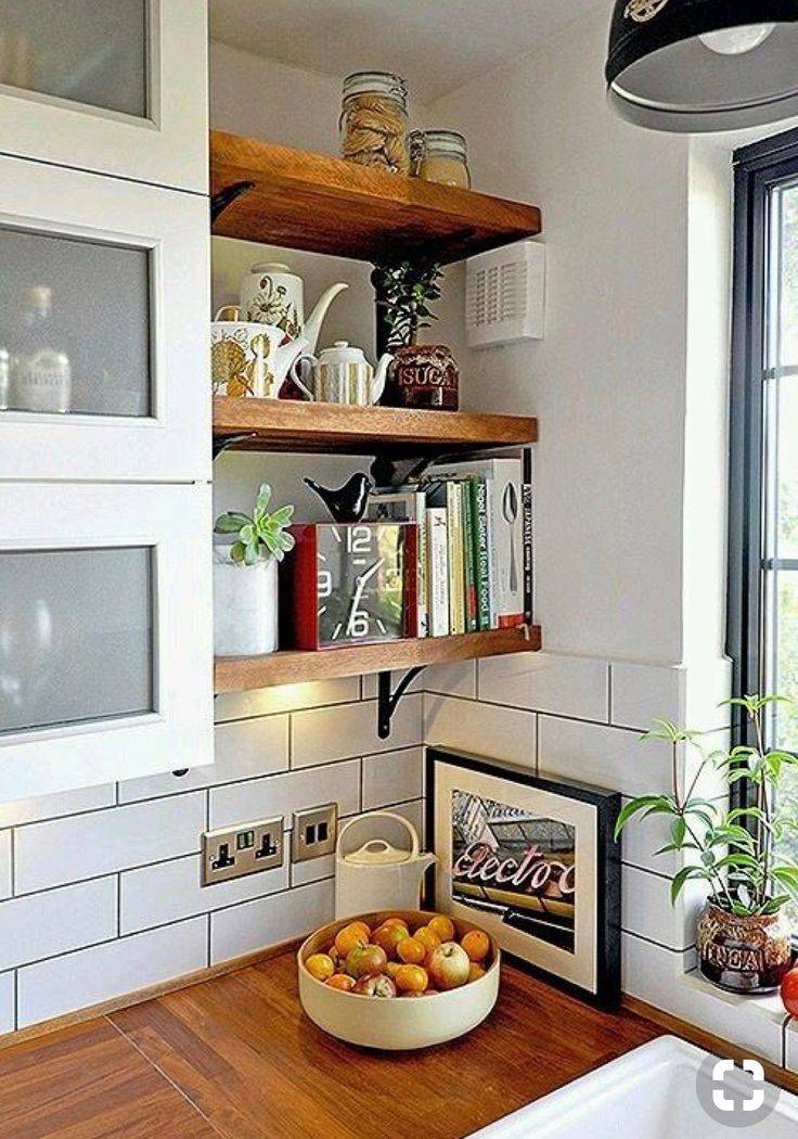 Les étagères ouvertes vous permettent de décharger visuellement la cuisine, ce qui sera une excellente solution pour un petit espace exigu. Pour qu'une telle cuisine ne semble pas encombrée, vous devez prendre soin de l'apparence des plats qui seront stockés à l'air libre.