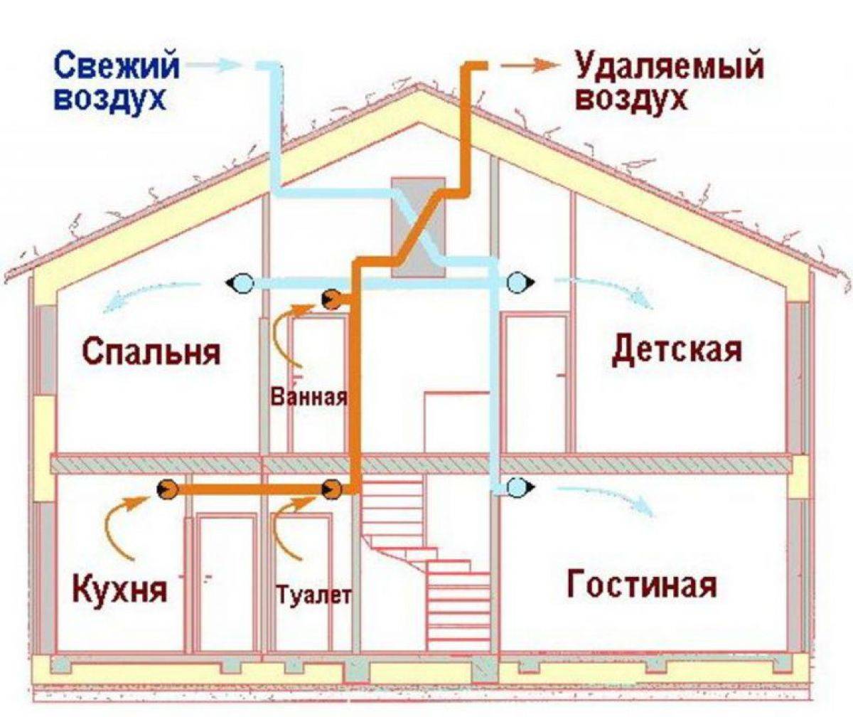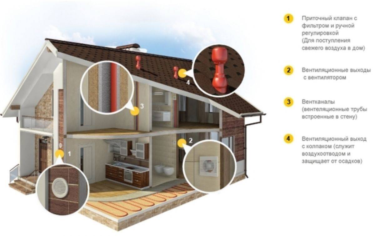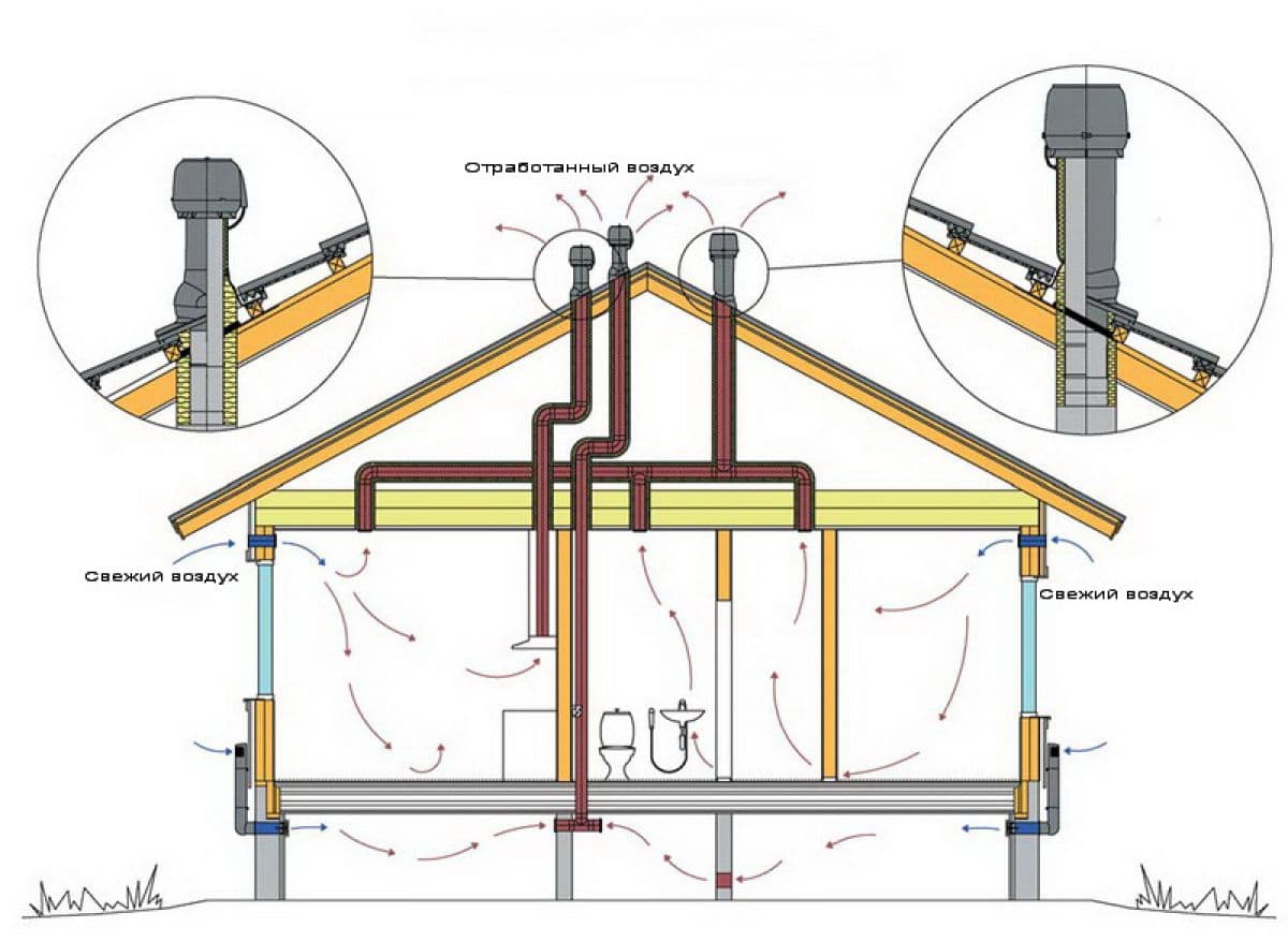 En plus des pièces d'habitation et des locaux techniques d'une maison privée, les systèmes de ventilation nécessitent un sous-sol et un entrepôt intégré, une fondation sans sous-sol, un grenier froid ou un grenier équipé. Dans les schémas naturels, ils sont pourvus de bouches d'aération, de pignon et de lucarnes.
