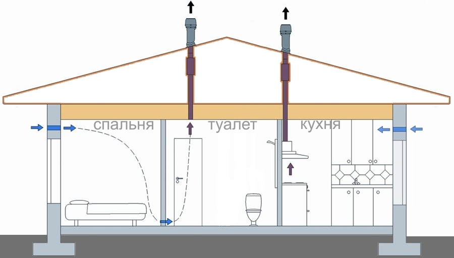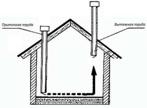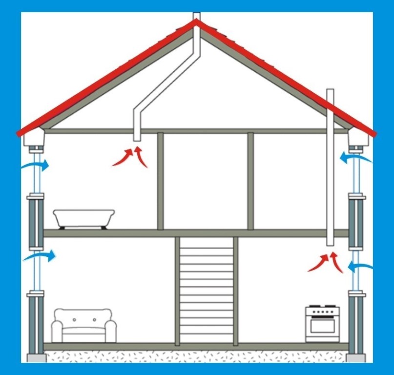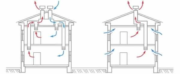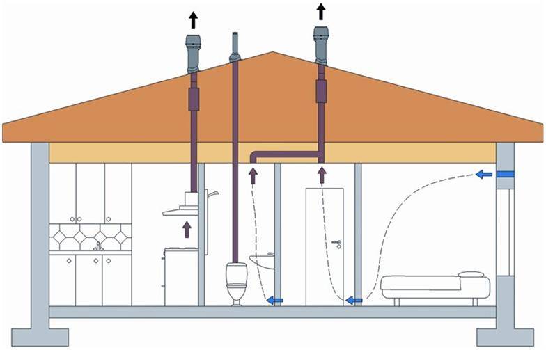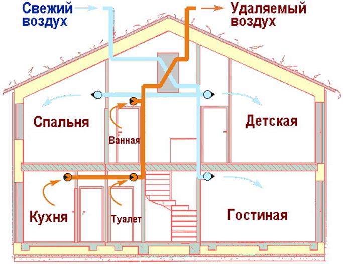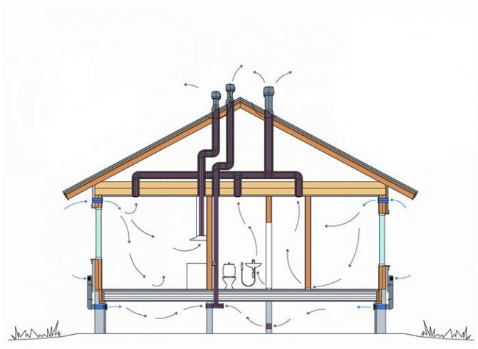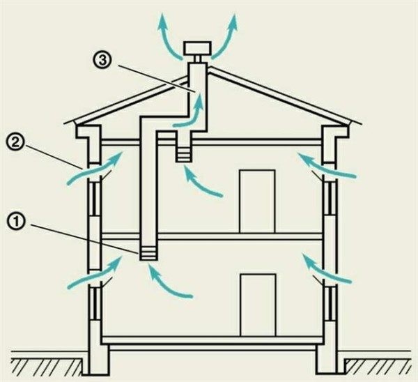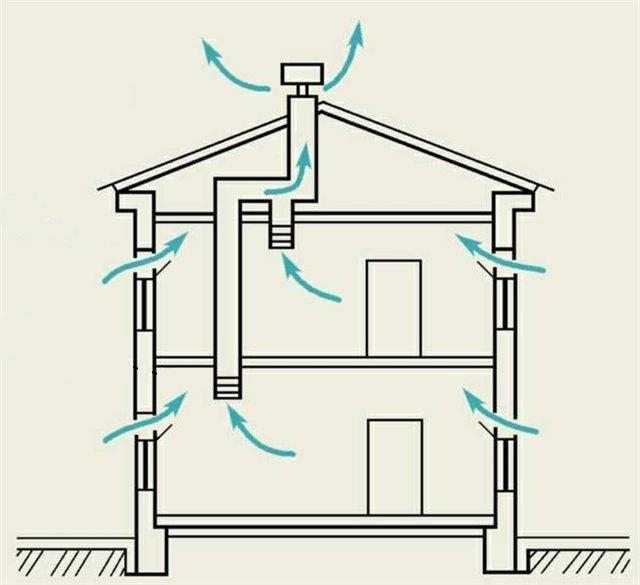 Avant de commencer à planifier et à installer la ventilation naturelle dans une maison privée de vos propres mains, vous devez vous familiariser avec les principes de son fonctionnement.Il fonctionne grâce au tirage naturel qui se produit à l'intérieur des tuyaux fonctionnant verticalement, tandis que l'air se déplace de bas en haut.