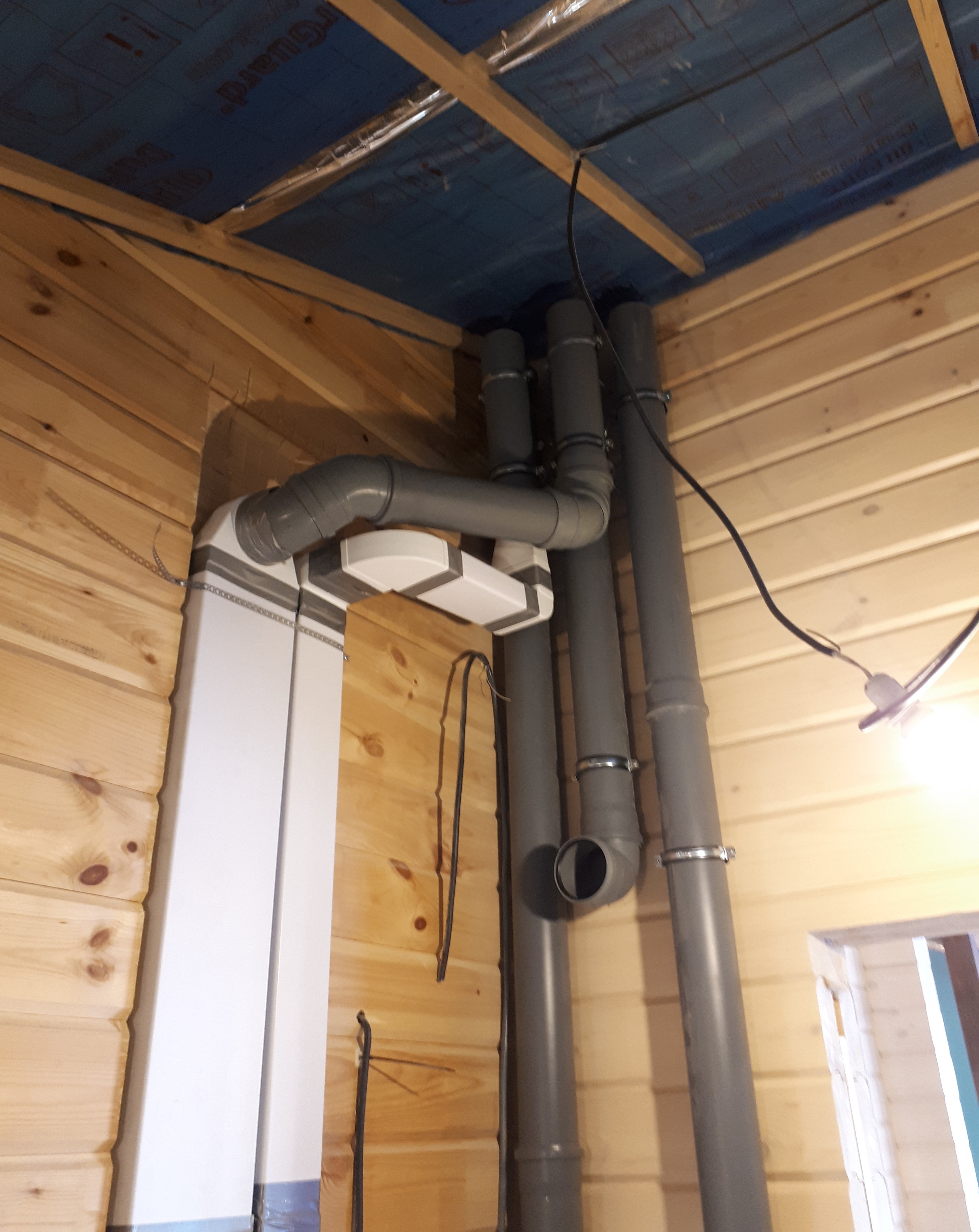 - Le débit d'air est donné à l'aide de reniflards, ils sont installés dans toutes les pièces. Un ventilateur commun est monté dans le grenier, auquel tout l'air d'échappement entre et est évacué.