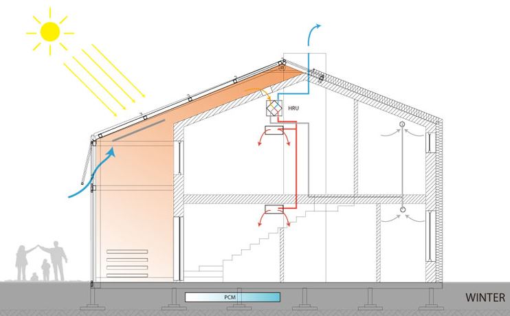 Des brise-vent, intégrés directement dans l'épaisseur des murs, assurent un apport mécanisé d'air pur. Pendant la saison froide, à l'aide d'éléments chauffants, il est également chauffé.