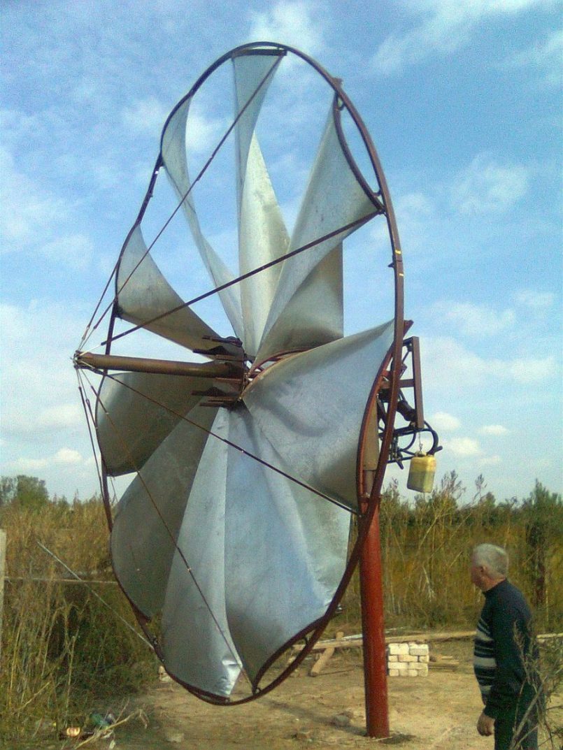 Les pales de type voile sont de simples bandes larges, comme sur un moulin à vent.Ce modèle est le plus évident et le plus facile à fabriquer. Cependant, son efficacité est si faible que cette forme n'est pratiquement pas utilisée dans les éoliennes modernes. L'efficacité dans ce cas est d'environ 10-12%.
