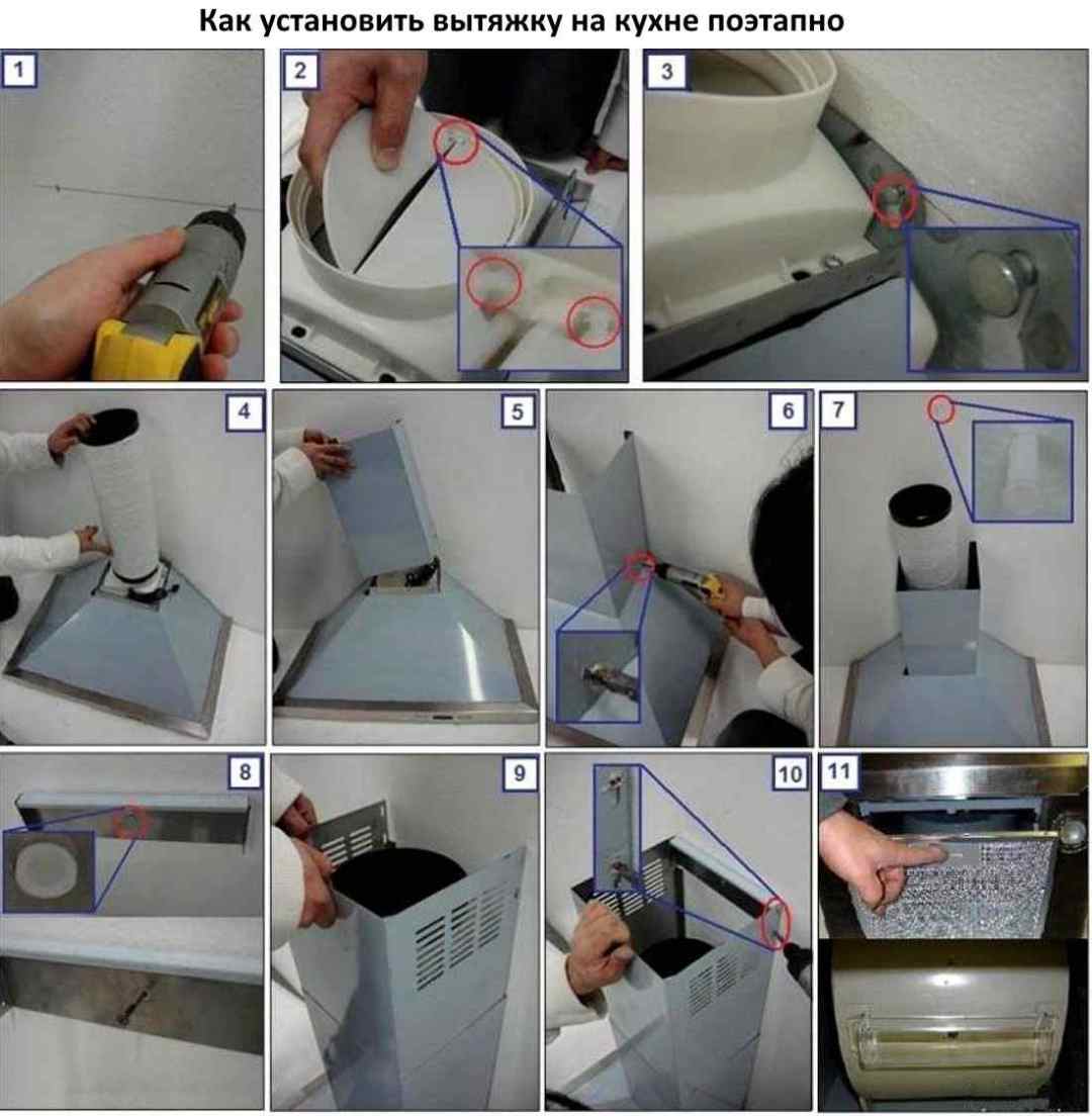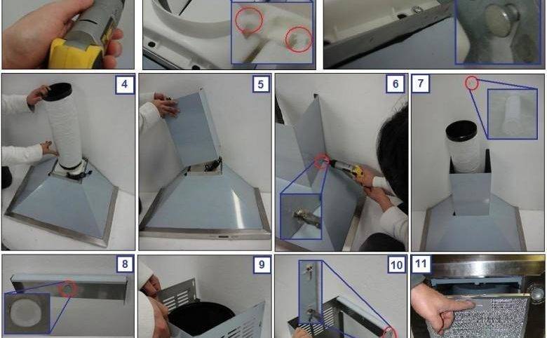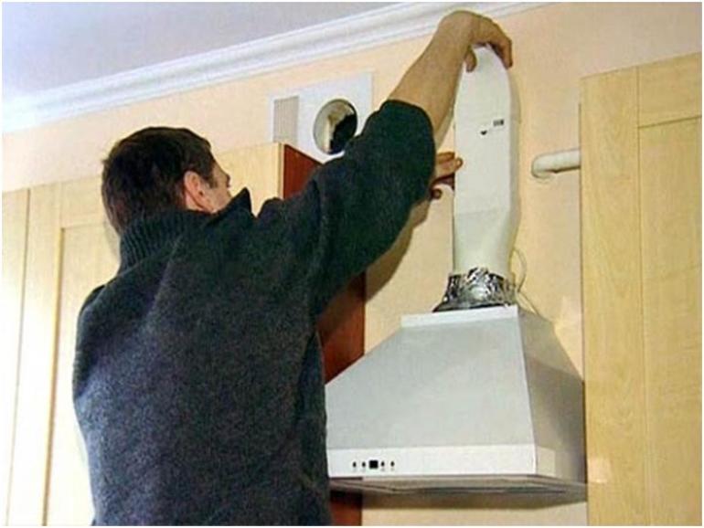 Une fois tous les préparatifs terminés, vous pouvez commencer l'installation des équipements. Cela vaut la peine de travailler avec soin, de ne pas soulever le capot par des zones décoratives qui peuvent se casser. Selon le type d'appareil, il peut être monté au plafond, au mur ou à l'intérieur d'un meuble, de sorte que les fixations sont installées là où l'appareil sera vissé. Après avoir installé la partie principale, vous devez mettre des tuyaux menant à la ventilation. Si la sortie d'air est dirigée vers la ventilation générale de la maison, pour le travail, vous devez acheter une ondulation ou utiliser un conduit d'air en plastique, utilisez également un adaptateur, une pince, un mastic et un ruban métallisé.