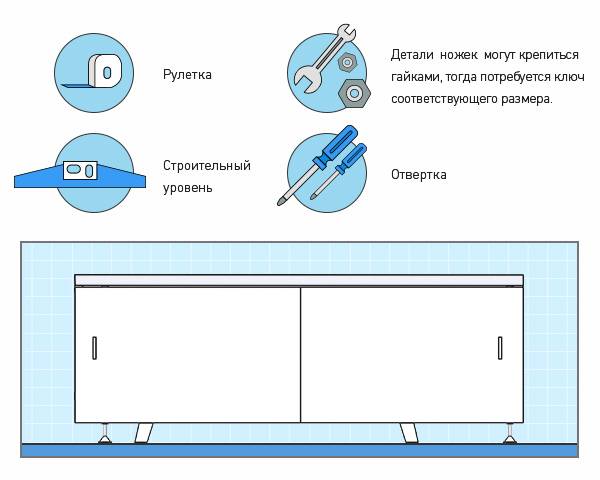 Parmi les outils, vous aurez besoin du minimum nécessaire - un ruban à mesurer, un tournevis, un niveau de construction. Pour les modèles avec pieds réglables en hauteur, les pièces du mécanisme de réglage peuvent être fixées avec des écrous, puis une clé de la taille appropriée est nécessaire.