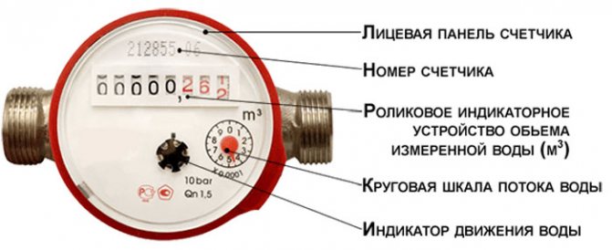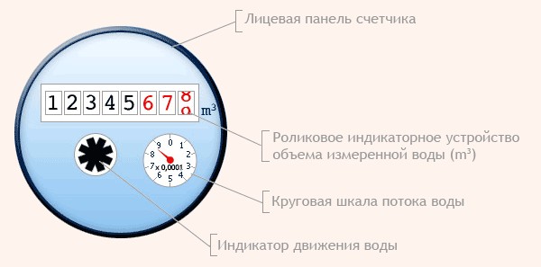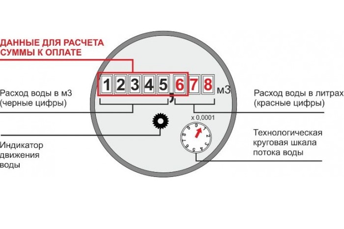Si vous regardez l'appareil, alors sur sa face avant sous le verre, vous pouvez voir beaucoup de chiffres qu'une personne non préparée est peu susceptible de déchiffrer. Donc, il y a 8 chiffres sur le cadran du compteur. Parmi ceux-ci, les cinq premiers sont noirs et trois sont rouges. Ces derniers signifient combien de litres d'eau ont été dépensés, ils ne doivent pas être pris en compte.