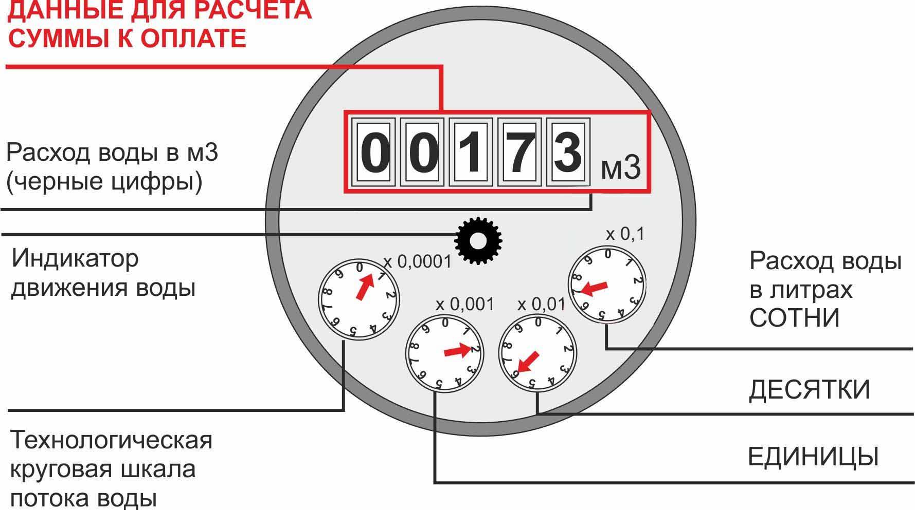 Une flèche indique les centaines de litres consommés, l'autre les dizaines, la troisième les unités. Pour obtenir la valeur de la partie fractionnaire, vous devez multiplier la valeur des centaines de litres par un facteur de 0,1, multiplier la valeur des dizaines par un facteur de 0,01 et multiplier les unités par 0,001. Additionnez ensuite les résultats des calculs.