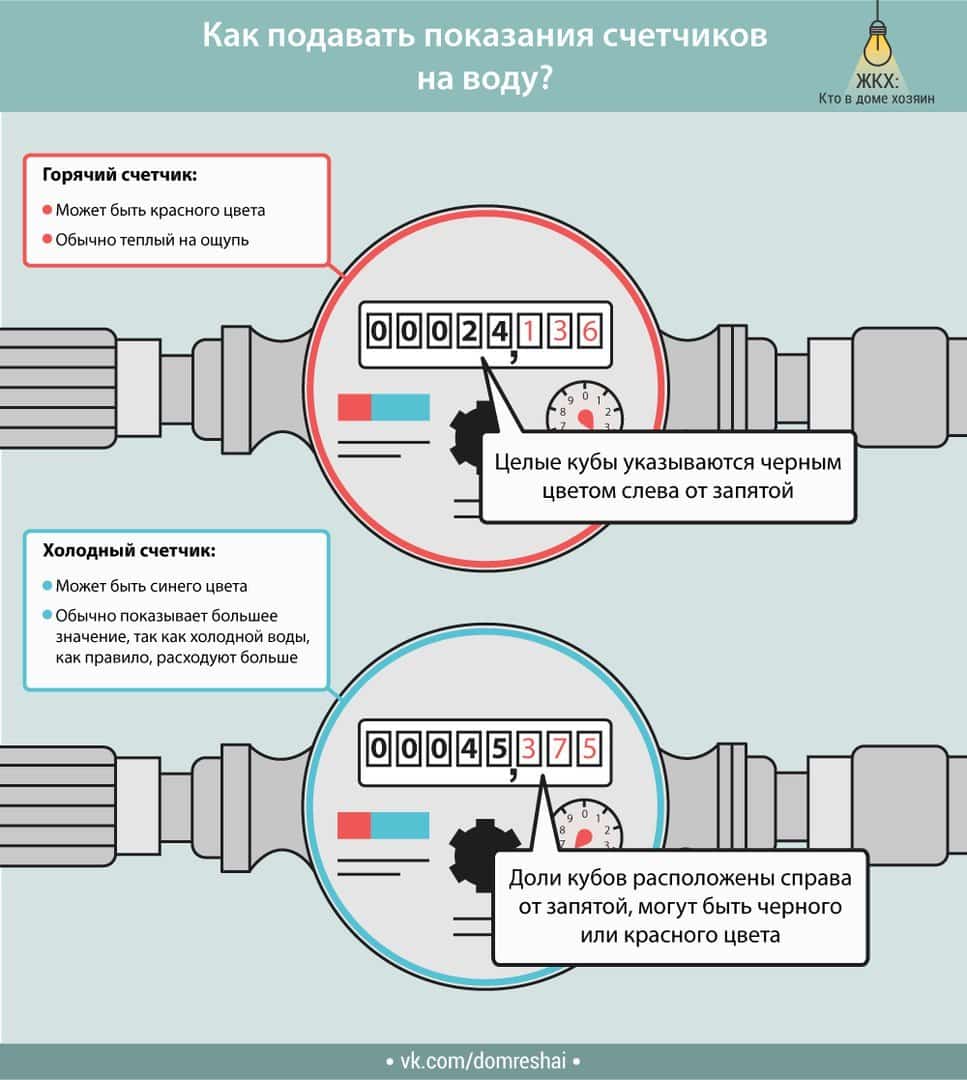 Tout d'abord, vous devez clarifier quel compteur d'eau se trouve devant vous. C'est facile à faire avec la couleur. Ainsi, les fabricants produisent des compteurs bleus ou noirs, qui montrent qu'ils prennent en compte la consommation d'eau froide. Les rouges, à leur tour, sont conçus pour l'eau chaude.